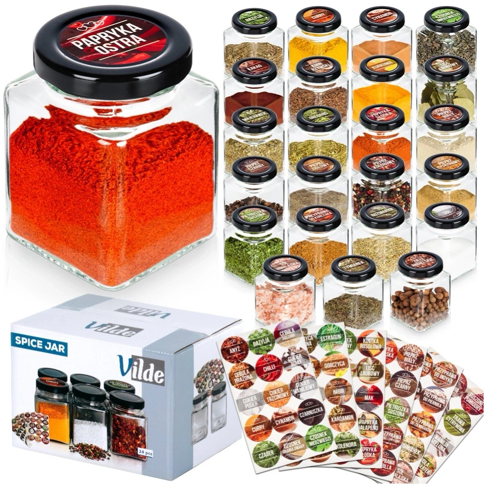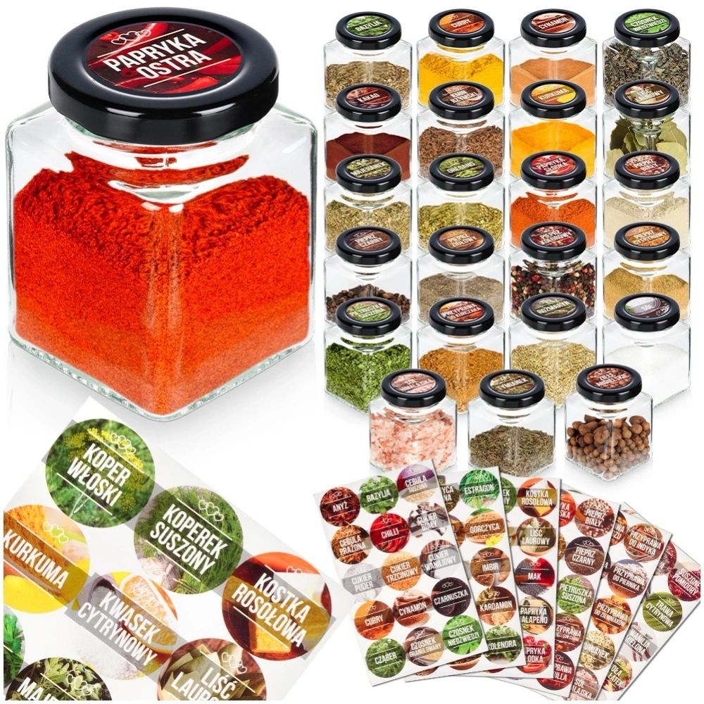 - Zestaw zawiera 24 słoiczki do przypraw i ziół oraz 90 naklejek ułatwiających oznaczanie zawartości. Pojemniki wykonane ze szkła, a pokrywki z metalu w czarnym kolorze.