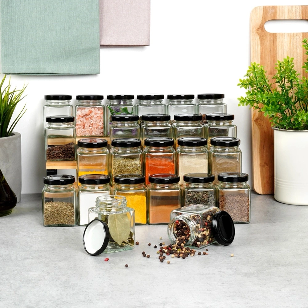 - Pojemniki na przyprawy z naklejkami - Praktyczny zestaw składający się 24 słoiczków do przechowywania przypraw i ziół w zestawie z praktycznymi naklejkami. Zestaw zapewnia porządek i wygodę w codziennym gotowaniu. Każdy pojemnik ma kwadratowy kształt i wymiary 5,5 x 5,5 x 7,5 cm i pojemność 100 ml.