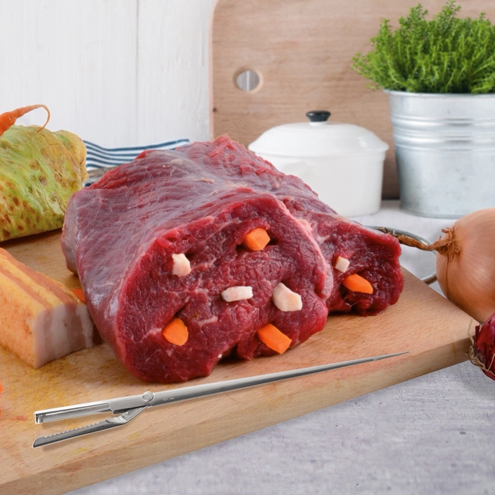 - Praktyczny szpikulec do nadziewania mięsa słoniną, boczkiem lub warzywami przed pieczeniem. Ułatwia równomierne rozprowadzenie składników, poprawiając smak i soczystość potraw.