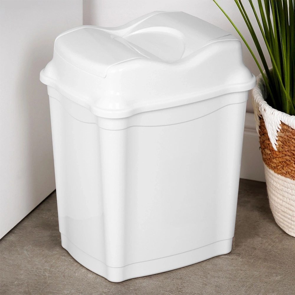 - Kosz na śmieci o pojemności 9 l. Wykonany z wytrzymałego tworzywa w białym kolorze. Wyposażony w uchylną pokrywkę, co ułatwia wyrzucanie odpadów.
