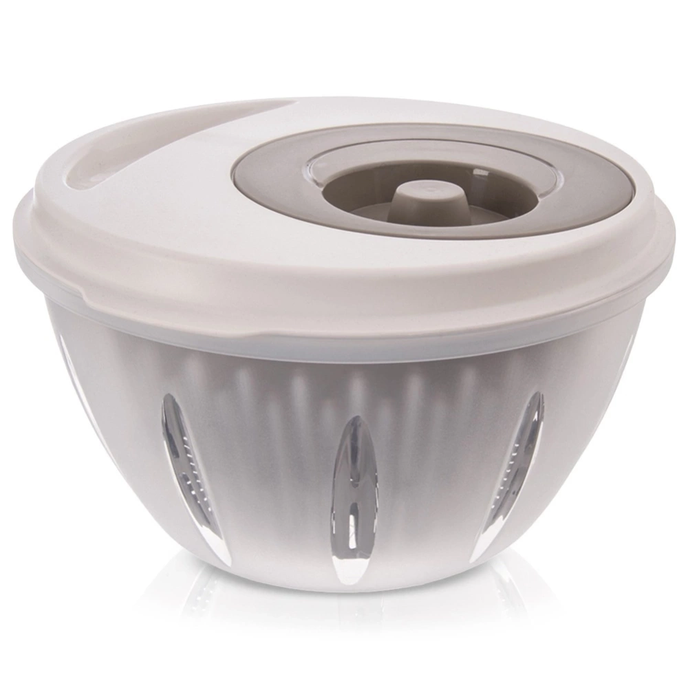 - Szybkie osuszanie sałaty - Wirówka pozwala na błyskawiczne osuszenie sałaty, dzięki czemu można szybko przygotować świeże i chrupiące sałatki. W ciągu kilku sekund pozbędziemy się nadmiaru wody i uzyskamy chrupiącą sałatę.