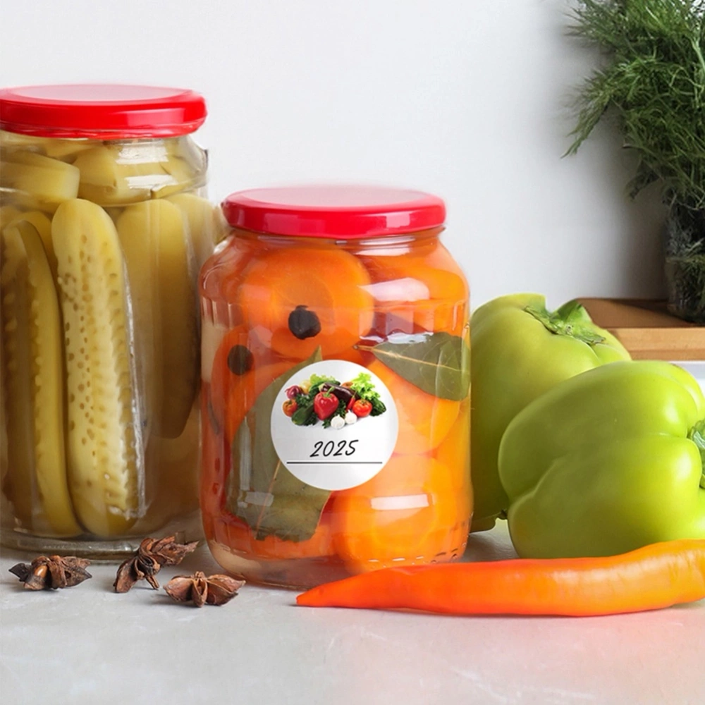 - Estetyczny i czytelny wygląd - Każda etykieta zawiera miejsce na wpisanie treści, takich jak skład, data przygotowania czy nazwa produktu. Motyw warzyw podkreśla domowy charakter przetworów.