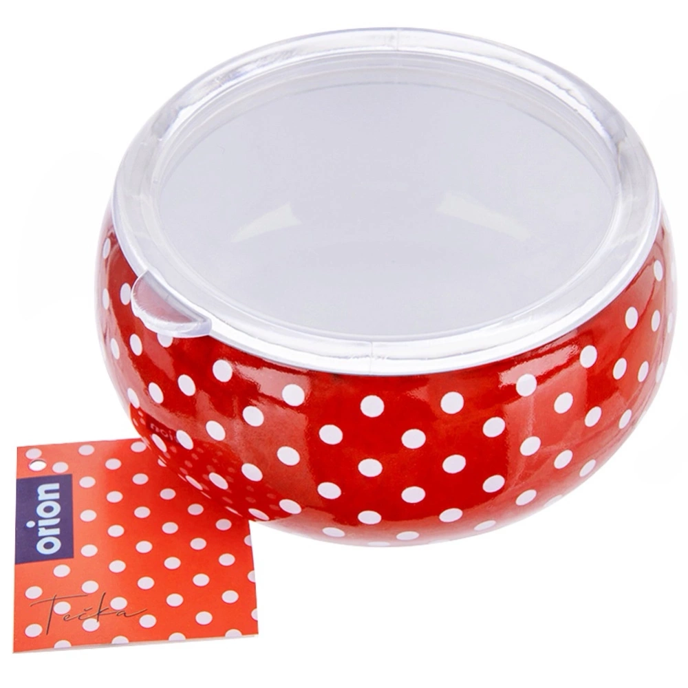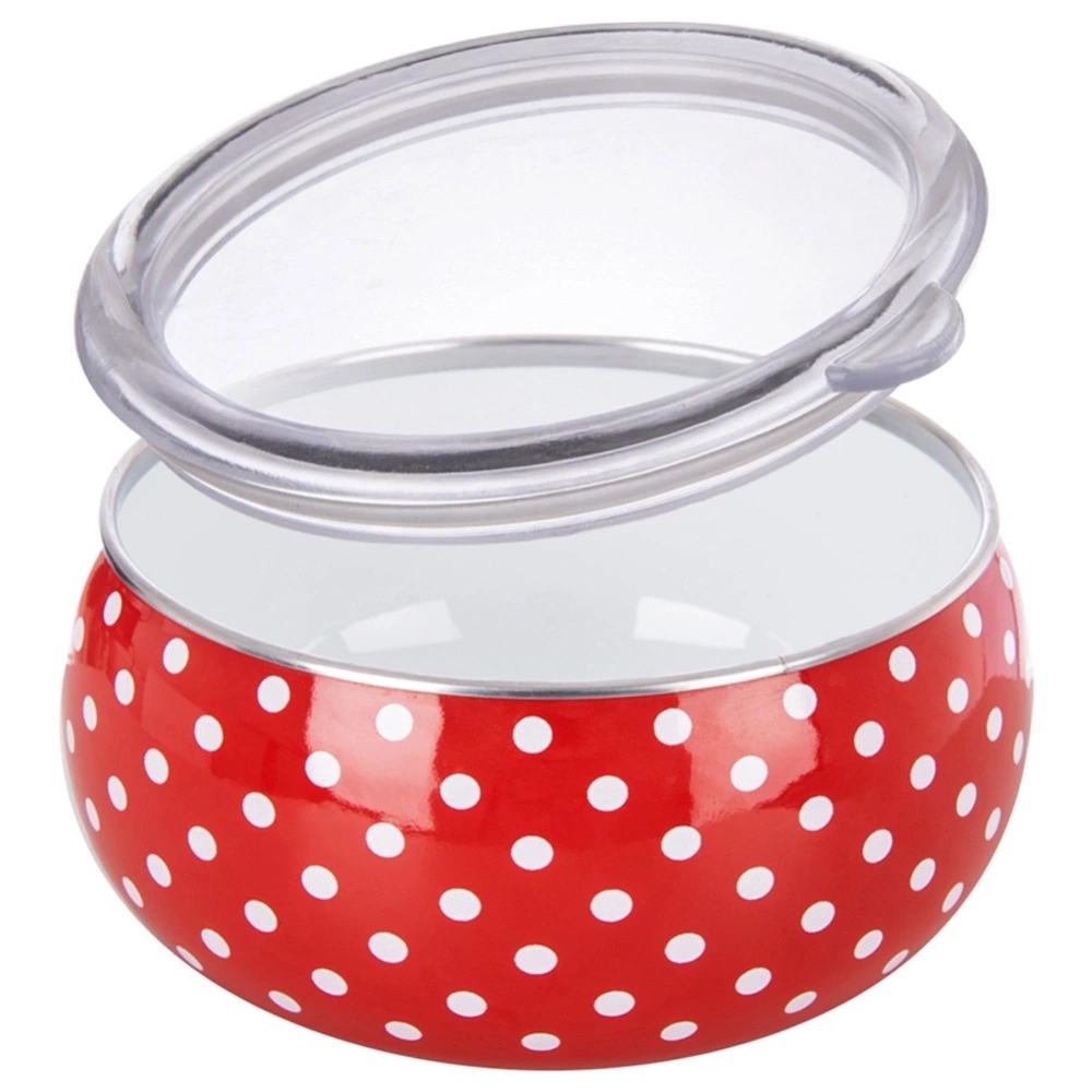 - Wykonana ze stali emaliowanej - Wykonana z najwyższej jakości stali emaliowanej w czerwonym kolorze. Posiada efektowane zdobienie w postaci białych grochów na powierzchni. Wnętrze miski jest w kolorze białym. Rant miski został wykonany ze stali nierdzewnej w srebrnym kolorze. Pokrywka wykonana z przezroczystego tworzywa. Emalia, którą pokryto naczynie jest materiałem przyjaznym dla zdrowia, a nawet bezpiecznym dla alergików.