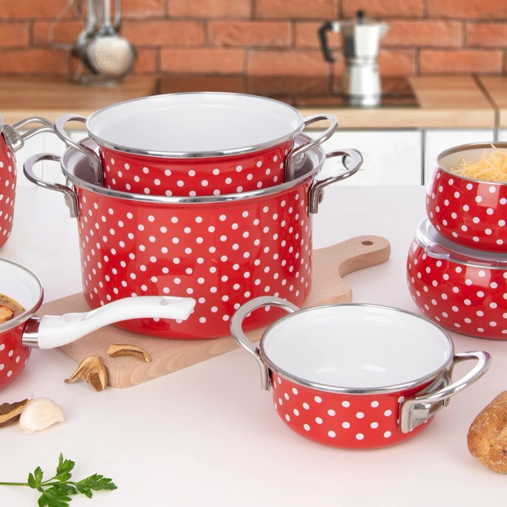 - Wykonany ze stali emaliowanej - Wykonany z najwyższej jakości stali emaliowanej w czerwonym kolorze. Posiada efektowane zdobienie w postaci białych grochów na powierzchni. Rant garnka oraz uchwyty wykonane ze stali nierdzewnej. Emalia, którą pokryto naczynie jest materiałem przyjaznym dla zdrowia, a nawet bezpiecznym dla alergików.