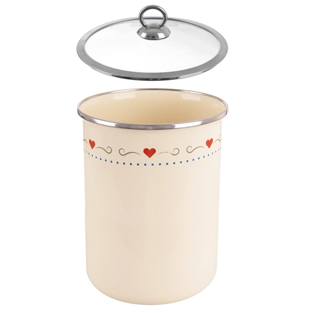 - Wykonany ze stali emaliowanej - Wykonany z najwyższej jakości stali emaliowanej w kremowym kolorze z delikatnym motywem serc. Rant pojemnika został wykonany ze stali nierdzewnej w srebrnym kolorze. W zestawie szklana pokrywka z rantem wykonanym ze stali nierdzewnej. Emalia, którą pokryto naczynie jest materiałem przyjaznym dla zdrowia, a nawet bezpiecznym dla alergików.