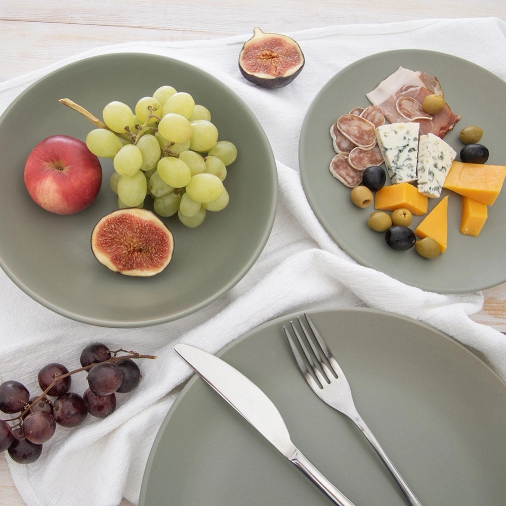 - Płytki talerz obiadowy o średnicy 27 cm. Wykonany z ceramiki w oliwkowym, matowym kolorze. Sprawdzi się do serwowania wielu rodzajów posiłków.