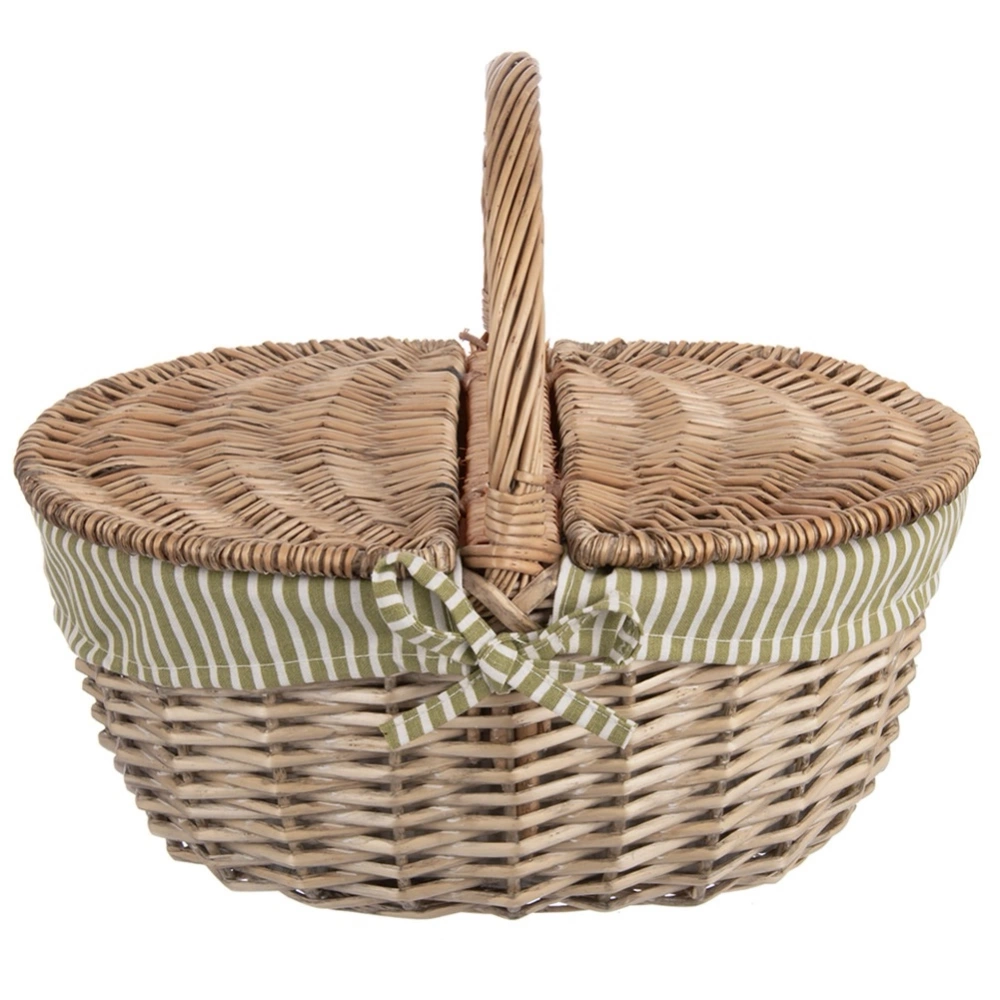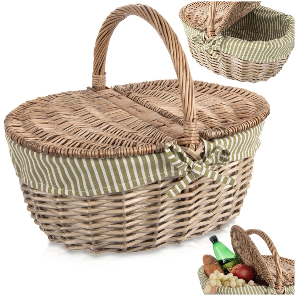 - Wiklinowy kosz piknikowy z uchylnym wiekiem i praktycznym uchwytem. Wyposażony w wyściółkę wewnętrzną. Idealny na piknik, ale sprawdzi się również jako kosz na grzyby.