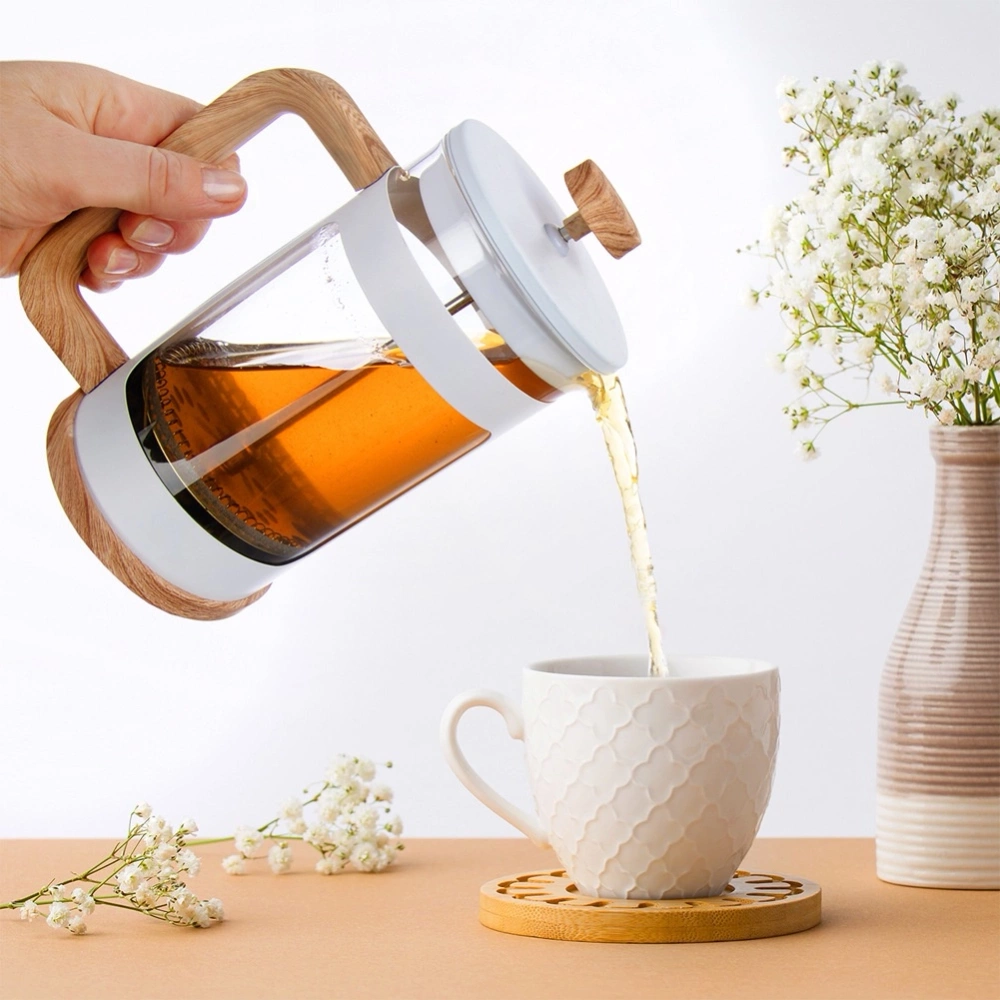 - Solidnie wykonany - Dzbanek wykonany ze szkła borokrzemowego. Tłok oraz sitko wykonane z najwyższej jakości stali nierdzewnej. Dzbanek posiada pokrywkę oraz obudowę wykonaną z tworzywa w białym kolorze. Posiada również elementy wykonane z tworzywa, które swoim wyglądem imitują drewno.