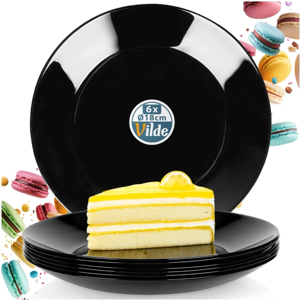 - Zestaw 6 talerzy deserowych wykonanych ze szkła opalowego w czarnym kolorze. Mają okrągły kształt. Nadają się do zmywarki i mikrofalówki.
