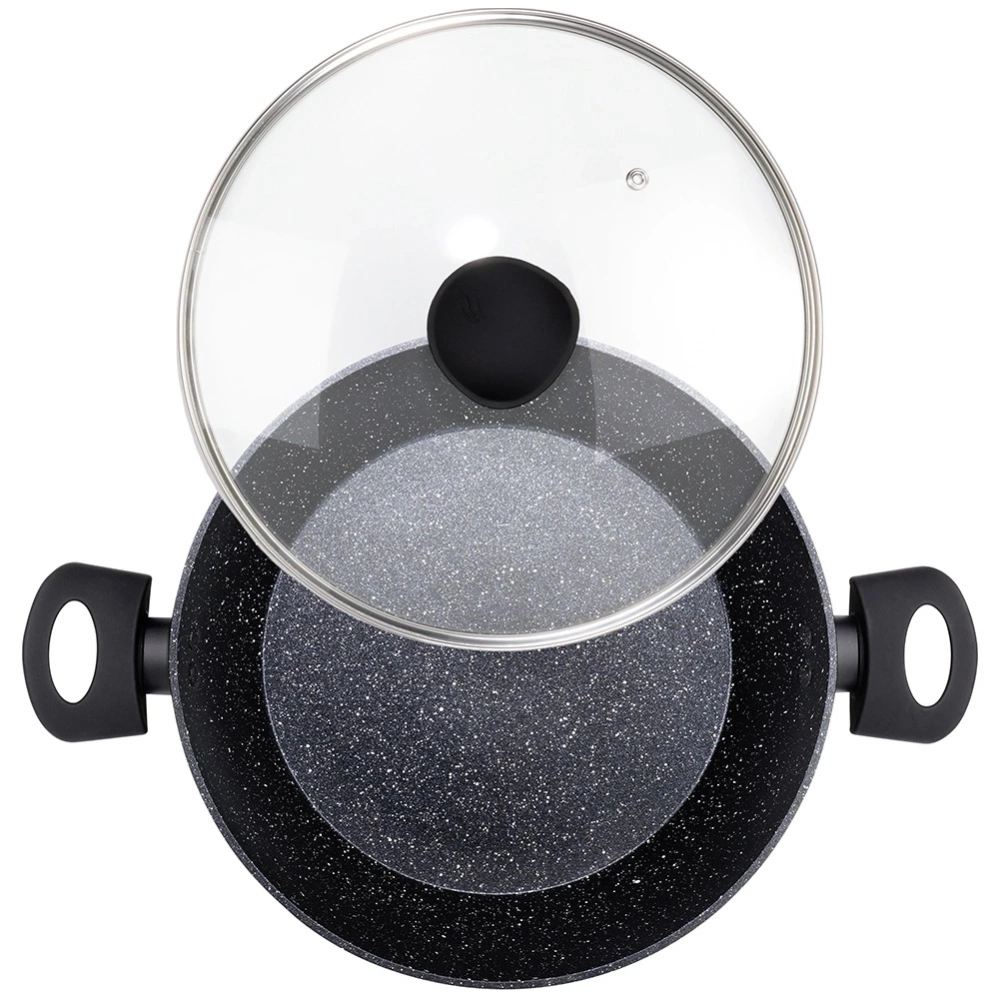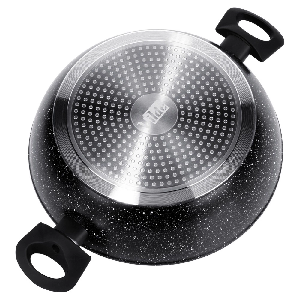 - Nieprzywierająca powłoka granitowa - Patelnia wykonana z aluminium ze stalową wkładką. Posiada nieprzywierającą powłoką granitową w czarnym kolorze. Powierzchnia nieprzywierająca umożliwia przygotowywanie zdrowych i smacznych posiłków z minimalną ilością tłuszczu. Patelnia i pokrywka posiadają uchwyt wykonany z najwyższej jakości, wytrzymałego tworzywa w czarnym kolorze.
