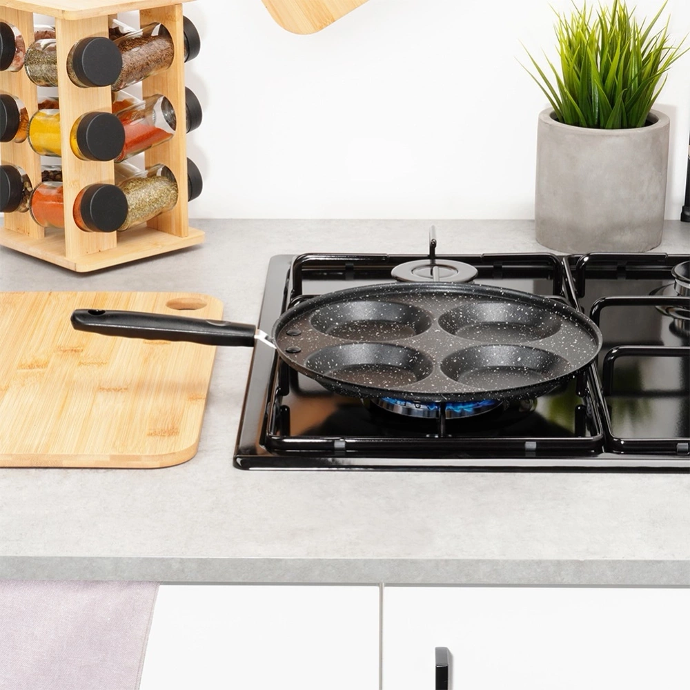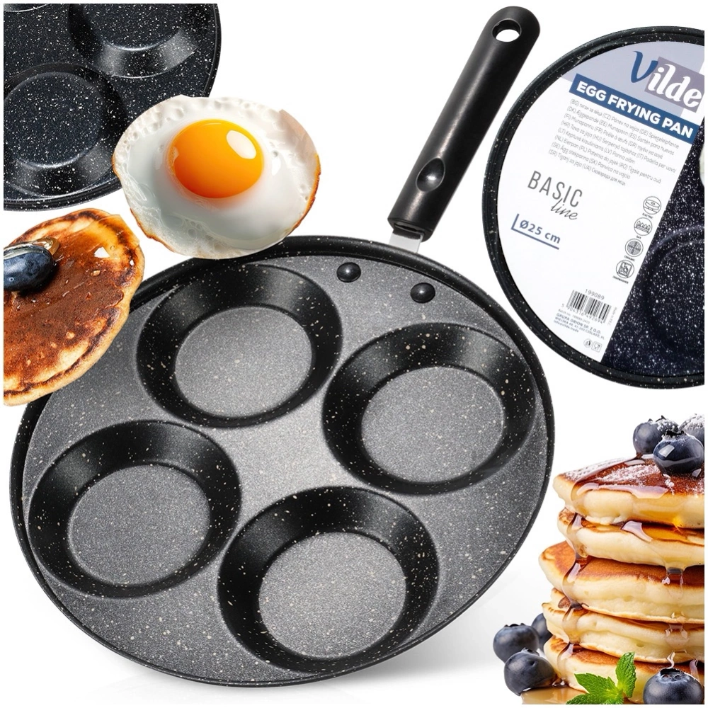 Nieprzywierająca patelnia do jajek o wyjątkowym, ponadczasowym wyglądzie. Patelnia utrzymana w modnym stylu, dzięki czemu efektownie prezentuje się w kuchni. Otwory pozwolą uzyskać okrągły kształt potraw. Z jej pomocą usmażymy pyszne jajka sadzone, ulubione placuszki śniadaniowe czy mini naleśniki. Wykonana z najwyższej jakości materiałów, odpowiednio użytkowana posłuży długie lata. Oryginalny produkt marki Vilde z linii Basic Line. Wyprodukowano zgodnie z europejskimi standardami.