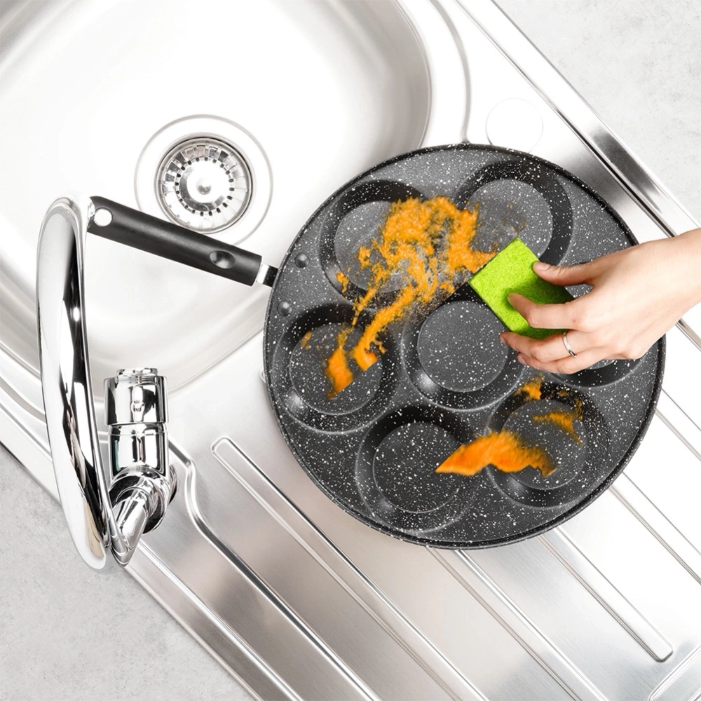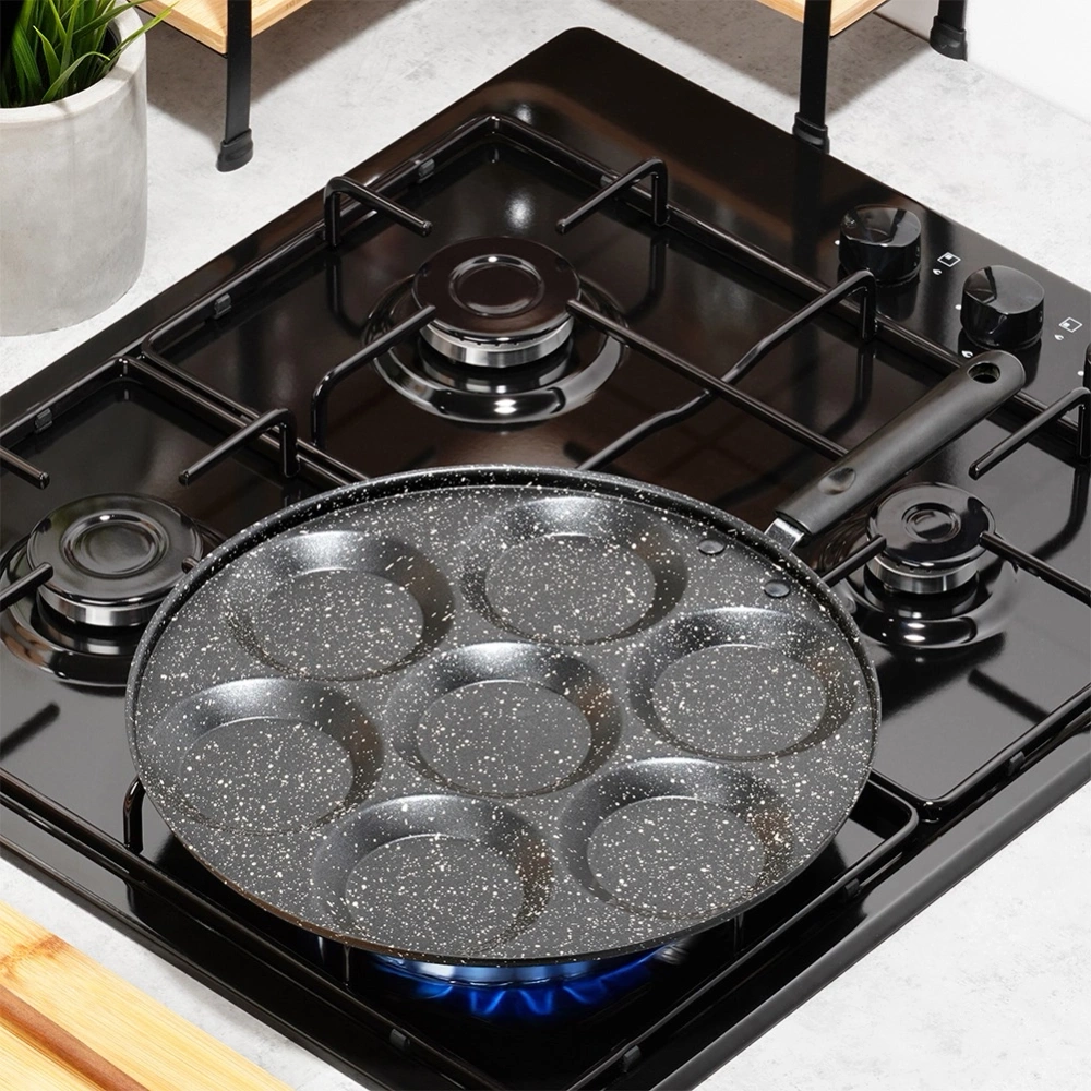 - Patelnia granitowa o średnicy 30 cm z 7 otworami. Idealna do przygotowania naleśników, placuszków oraz jajek. Nadaje się do zmywarki.