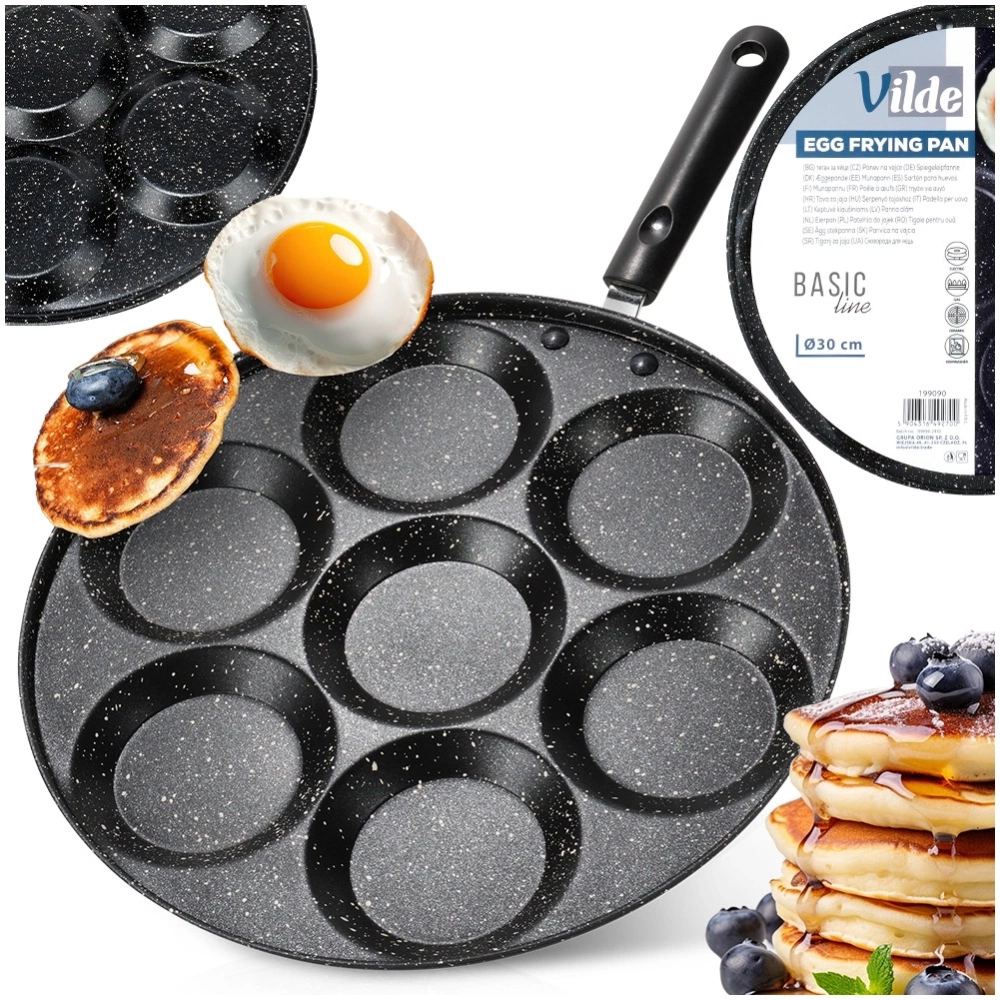 Nieprzywierająca patelnia do jajek o wyjątkowym, ponadczasowym wyglądzie. Patelnia utrzymana w modnym stylu, dzięki czemu efektownie prezentuje się w kuchni. Otwory pozwolą uzyskać okrągły kształt potraw. Z jej pomocą usmażymy pyszne jajka sadzone, ulubione placuszki śniadaniowe czy mini naleśniki. Wykonana z najwyższej jakości materiałów, odpowiednio użytkowana posłuży długie lata. Oryginalny produkt marki Vilde z linii Basic Line. Wyprodukowano zgodnie z europejskimi standardami.