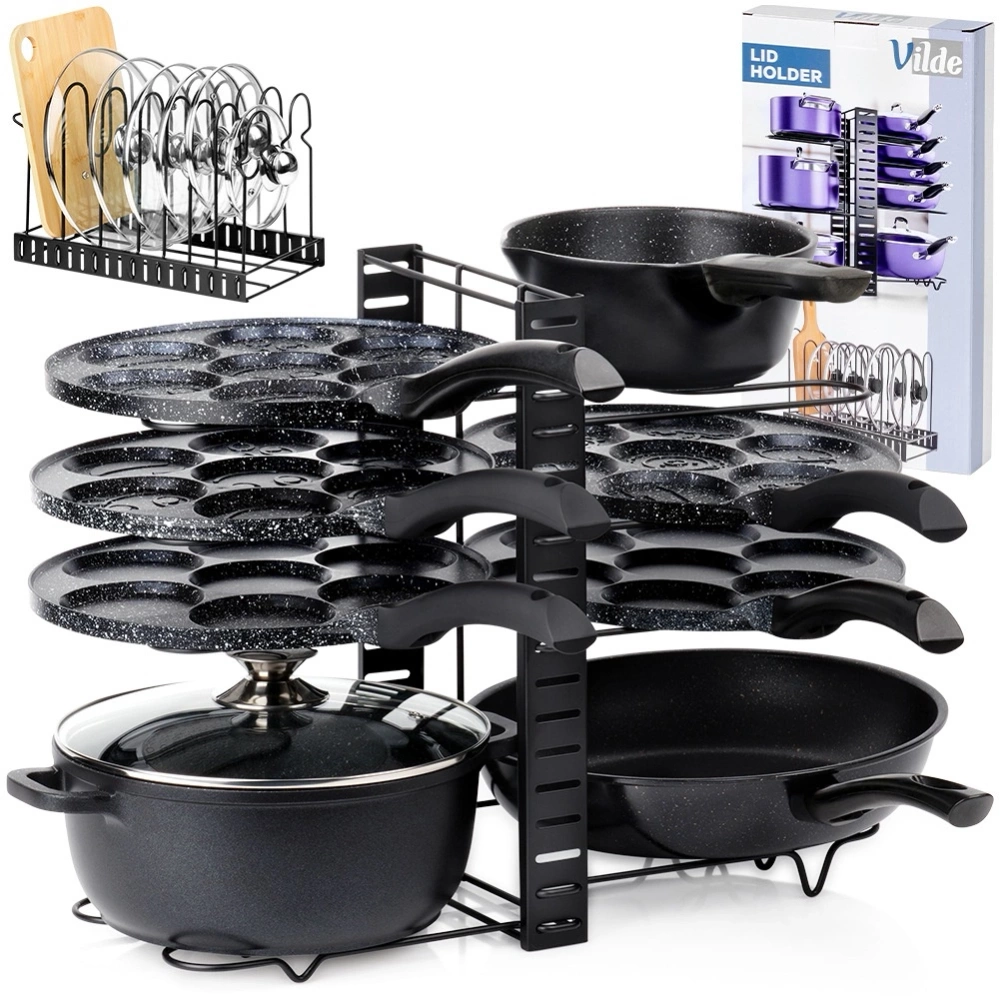 - Stojak 2w1 do przechowywania garnków, patelni i pokrywek. Możliwość użytkowania jako oddzielny organizer na pokrywki lub talerze. Zapewnia oszczędność miejsca i porządek w kuchni.