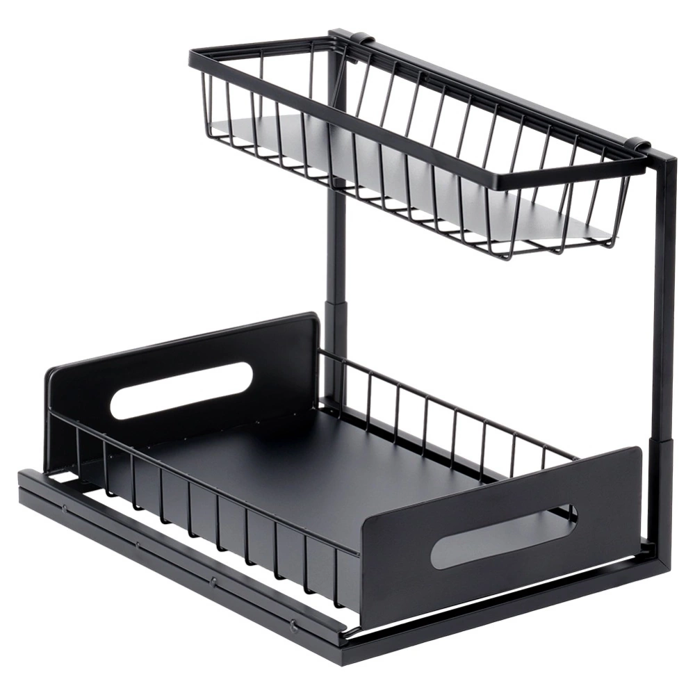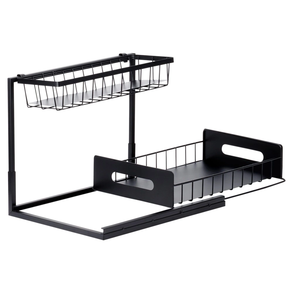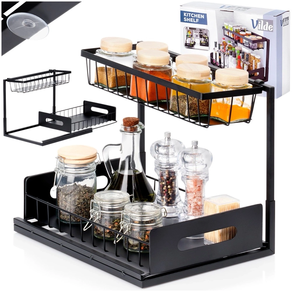- Dwupoziomowa półka kuchenna z wysuwaną dolną szufladą. Idealna do organizacji przypraw, słoiczków i butelek. Metalowa w czarnym kolorze.