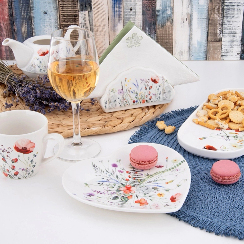 - Talerz deserowy w kształcie serca o wymiarach 17,5x17 cm. Wykonany z porcelany z efektownym dekorem w polne kwiaty. Sprawdzi się do serwowania ciast, deserów i przekąsek.