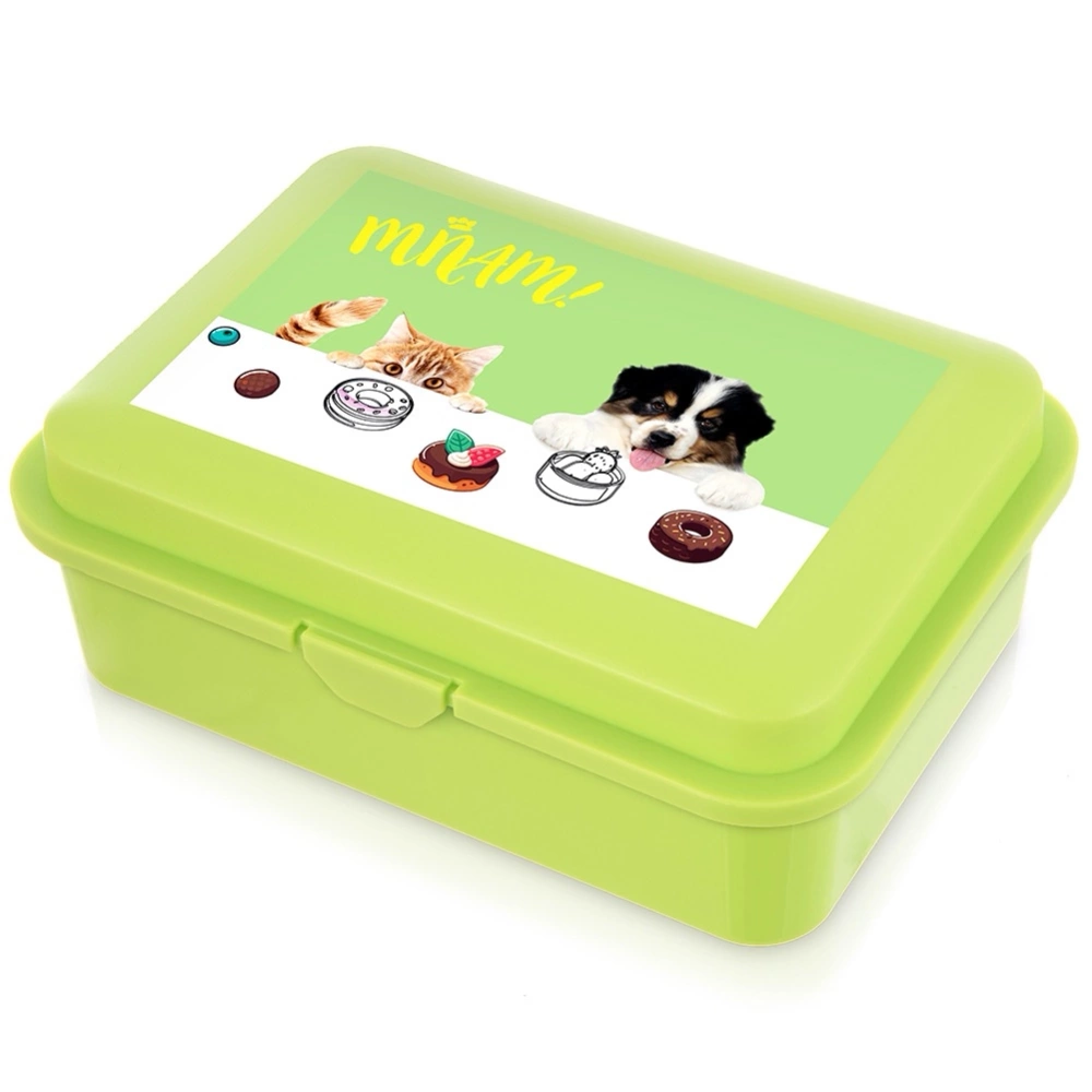 - Solidnie wykonany - Pojemnik wykonany z wysokiej jakości tworzywa w kolorze zielonym. Dodatkowo posiada nadruk z motywem zwierząt i słodkości.