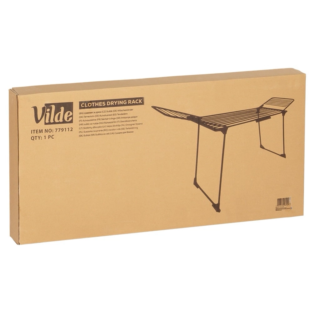 Suszarka na pranie z regulowaną powierzchnią suszenia. Suszarka wykonana z solidnych materiałów, utrzymana w modnej, czarnej kolorystyce. Dzięki regulowanej długości idealnie sprawdzi się do zawieszania mniejszych, jak i większej ilości prania. Dodatkowe uchwyty ułatwią organizację odzieży lub bielizny podczas suszenia, a także pozwalają zaoszczędzić miejsce. Dzięki funkcji składania suszarka po złożeniu nie zajmuje dużo miejsca. Niezbędna w każdym domu. Odpowiednio użytkowana posłuży długie lata. Oryginalny produkt marki Vilde. Wyprodukowano zgodnie z europejskimi standardami.