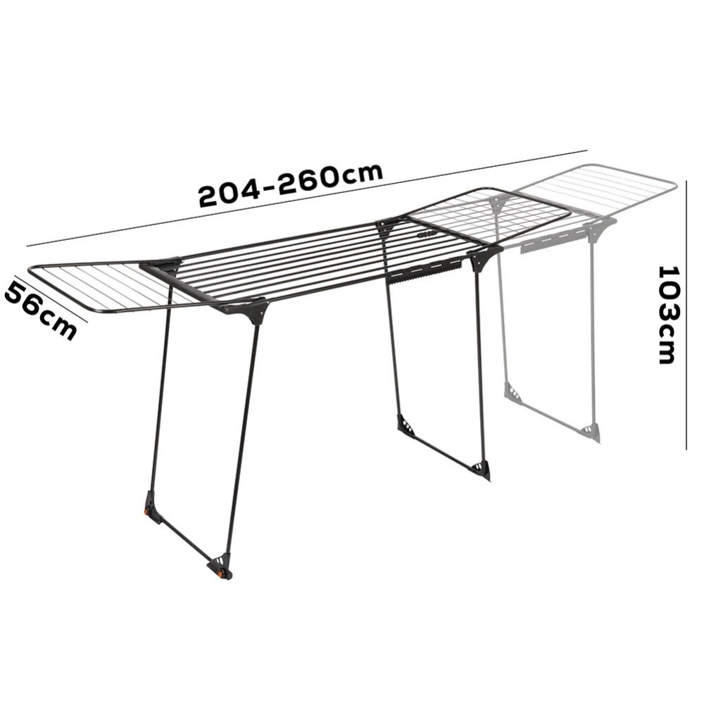 - Rozsuwana suszarka na pranie od 204 do 260 cm - Suszarka na pranie oraz bieliznę teleskopowa XXL posiada regulowaną długość od 204 cm do 260 cm, co pozwoli dostosować suszarkę do swoich potrzeb. Wymiary całkowite suszarki po rozłożeniu wynoszą: 260 x 56 x 103 cm.
