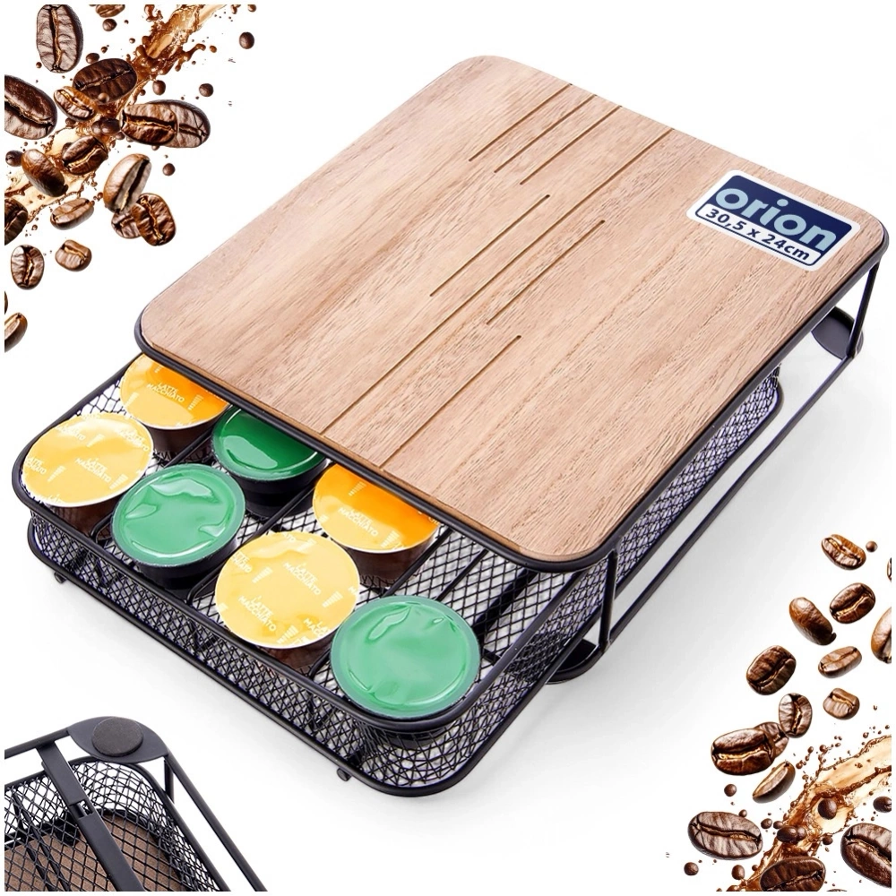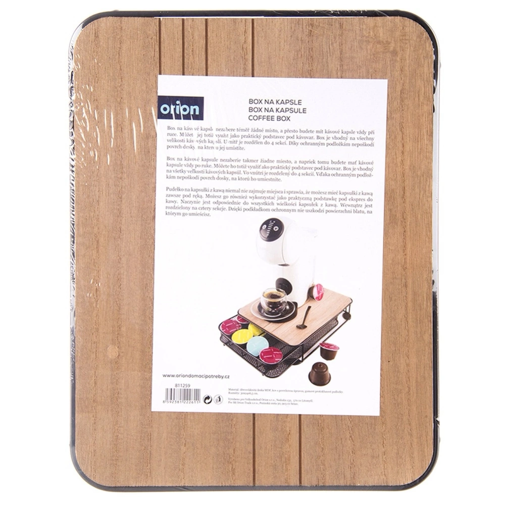 Pojemnik na kapsułki do kawy, wykonany z wytrzymałych materiałów. Dzięki niemu można w wygodny i efektowny sposób przechowywać ulubione kapsułki do ekspresu. Utrzymany w modnym połączeniu czerni z drewnem, dzięki czemu pięknie prezentuje się w kuchni i stanowi jednocześnie element dekoracyjny. Kapsułki w organizatorze można rozłożyć w czterech rzędach, a wysuwana z boku szuflada ułatwia dostęp do nich i ich wyjmowanie. Doskonały pomysł na prezent dla osób korzystających z ekspresu na kapsułki. Oryginalny produkt czeskiej marki Orion. Wyprodukowano zgodnie z europejskimi standardami.