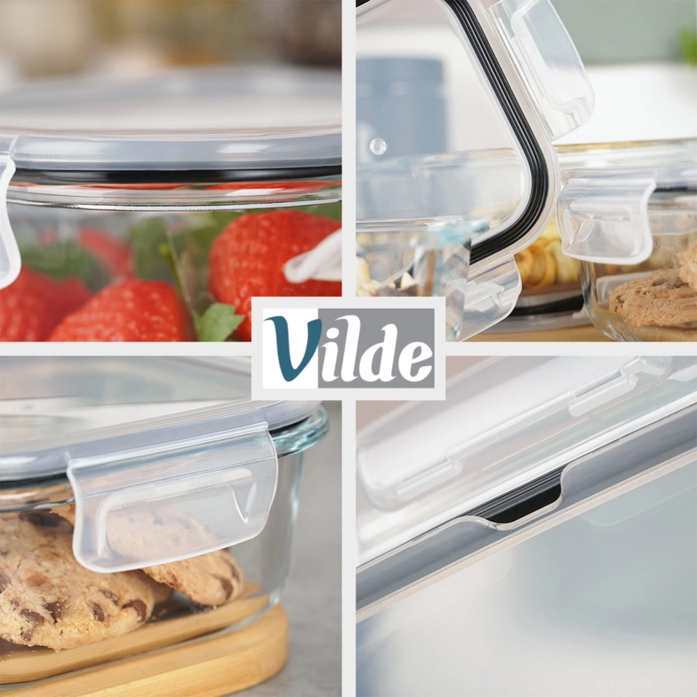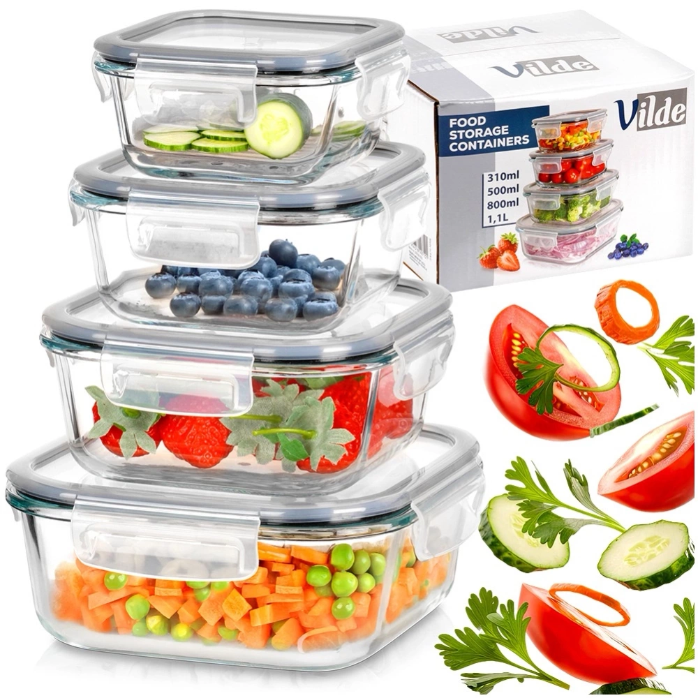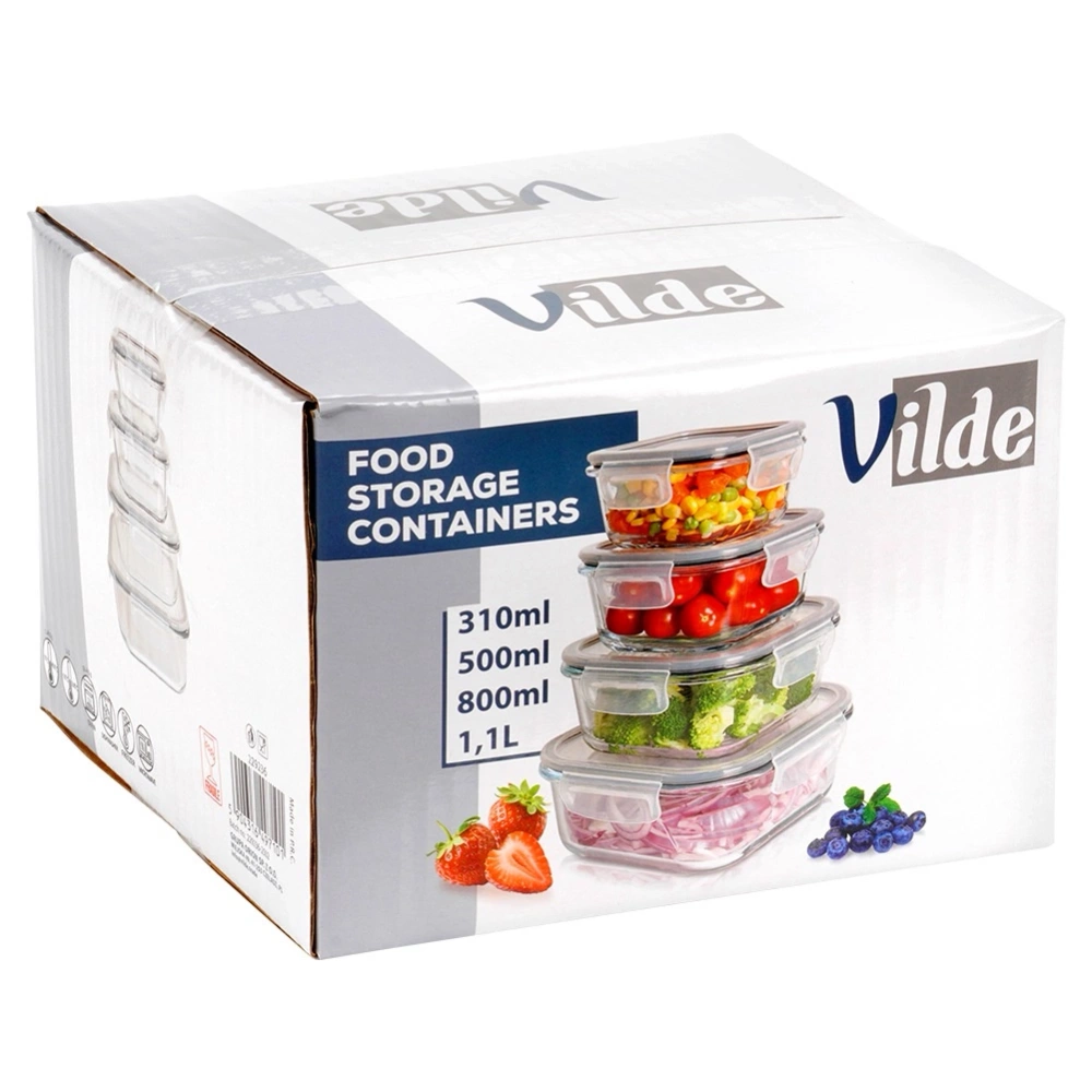Zestaw pojemników kuchennych w różnych rozmiarach. W zestawie: 1x pojemnik o wymiarach 17,5 x 17,5 x 7,5 cm i pojemności 1,1 l, 1x pojemnik o wymiarach 14,5 x 14,5 x 7 cm i pojemność 800 ml, 1x pojemnik o wymiarach 12,5 x 12,5 x 6,5 cm i pojemności 500 ml, 1x pojemnik o wymiarach 11 x 11 x 5,5 cm i pojemności 310 ml. Przydatne w każdej kuchni. Pozwolą na odpowiednie przechowywanie produktów, wprowadzając ład i porządek do kuchni. Oryginalny produkt marki Vilde. Wyprodukowano zgodnie z europejskimi standardami.