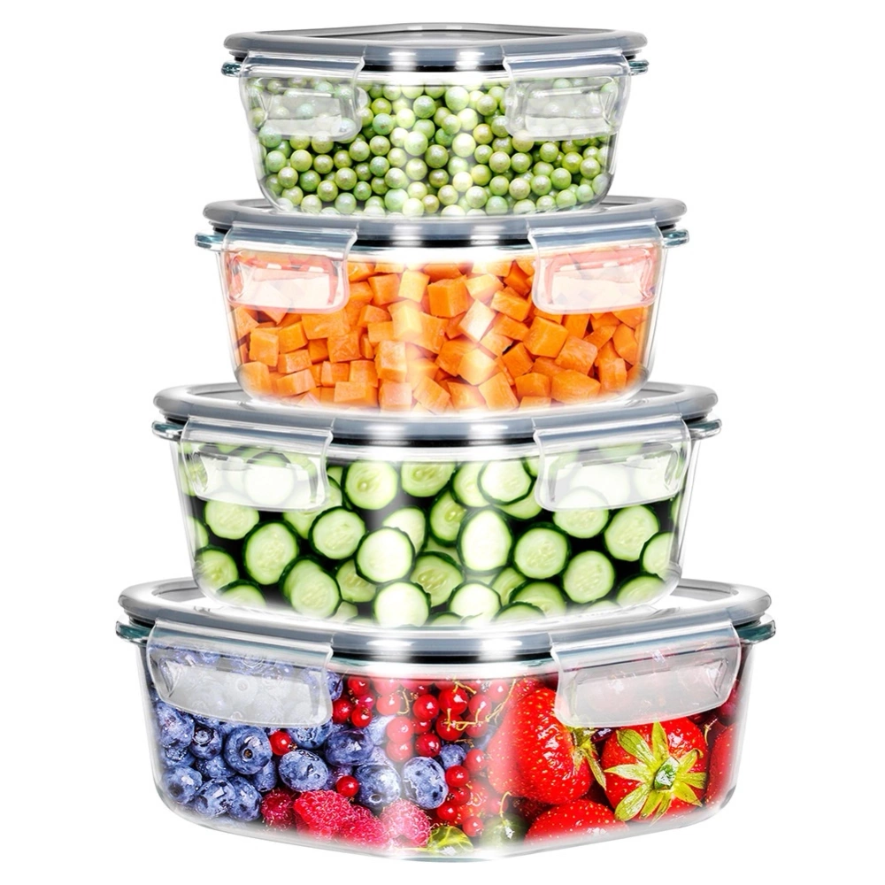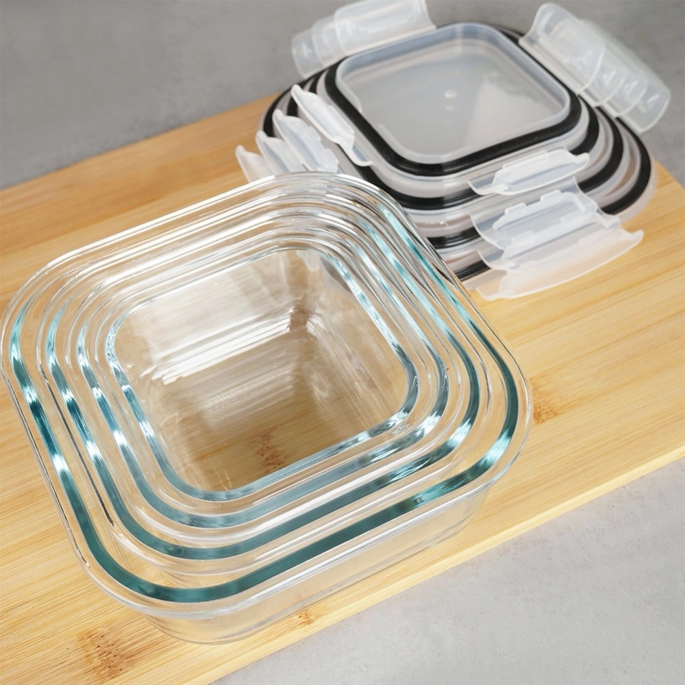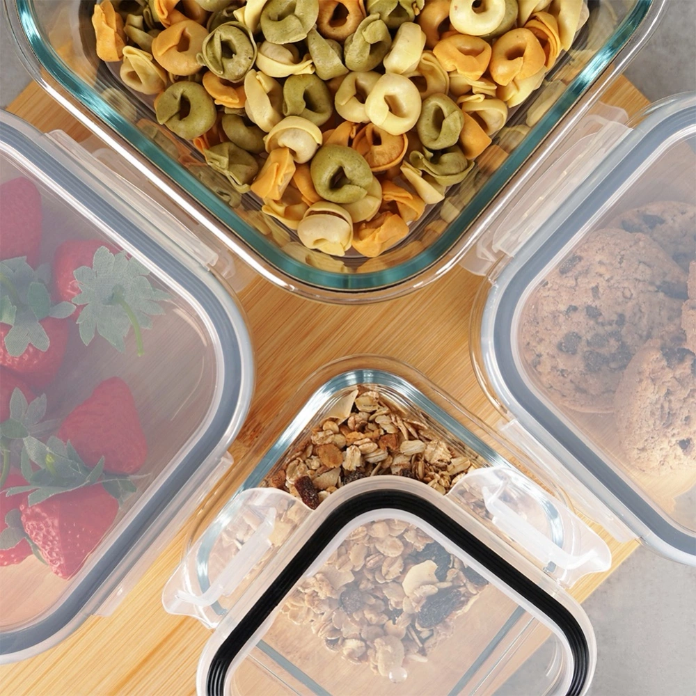 - Zestaw 4 pojemników kuchennych w różnych rozmiarach. Idealne do przechowywania żywności oraz produktów sypkich. Wykonane ze szkła, pokrywka jest szczelna dzięki uszczelce.