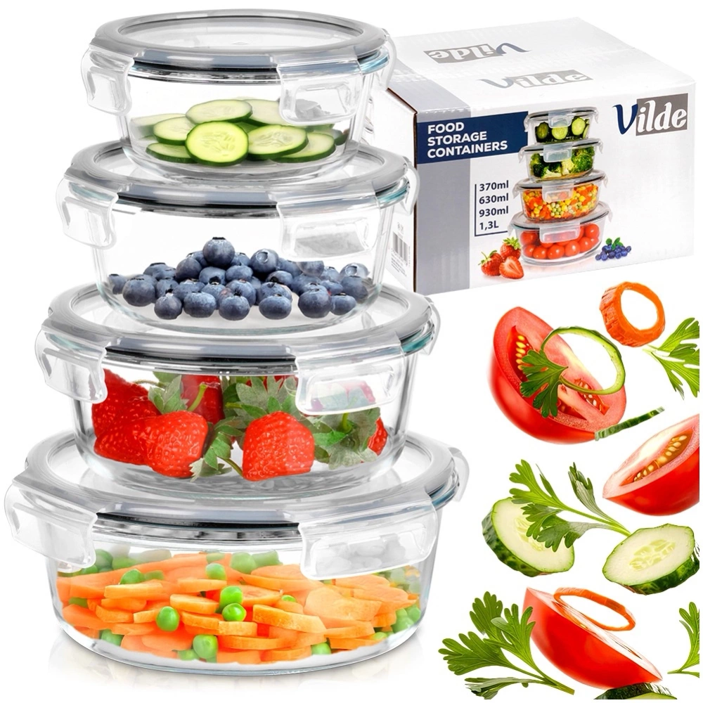 Zestaw pojemników kuchennych w różnych rozmiarach. W zestawie: 1x pojemnik o średnicy 19 cm, wysokości 8 cm i pojemności 1,3 l, 1x pojemnik o średnicy 17 cm, wysokości 7 cm i pojemności 930 ml, 1x pojemnik o średnicy 15 cm, wysokości 6,5 cm i pojemności 630 ml, 1x pojemnik o średnicy 13 cm, wysokości 6 cm i pojemności 370 ml. Przydatne w każdej kuchni. Pozwolą na odpowiednie przechowywanie produktów, wprowadzając ład i porządek do kuchni. Oryginalny produkt marki Vilde. Wyprodukowano zgodnie z europejskimi standardami.