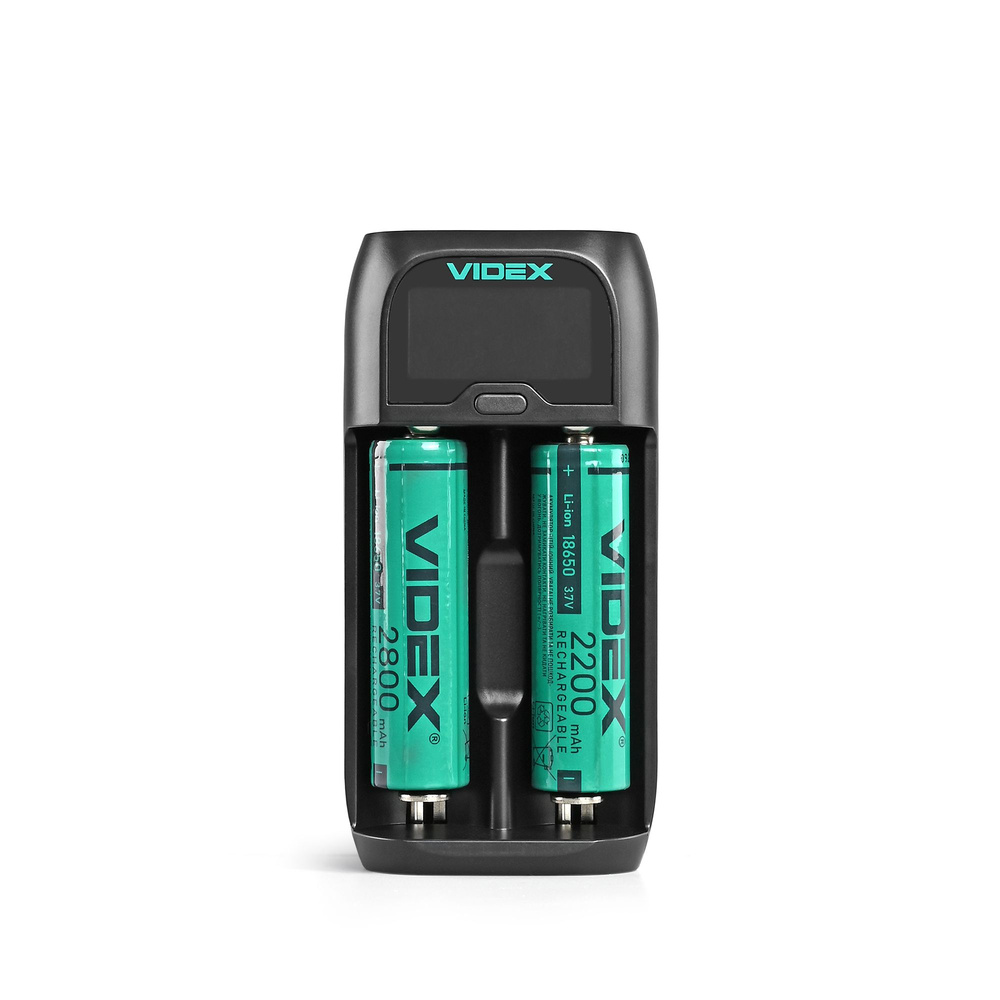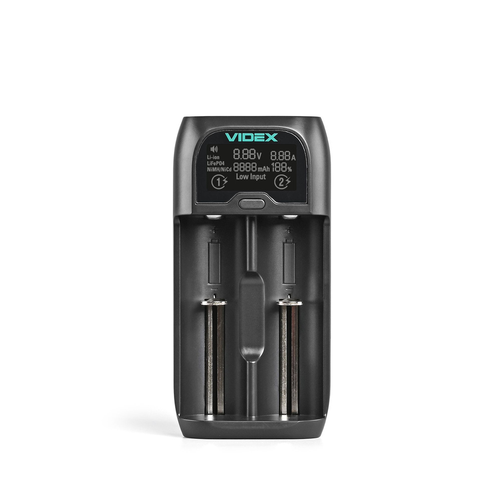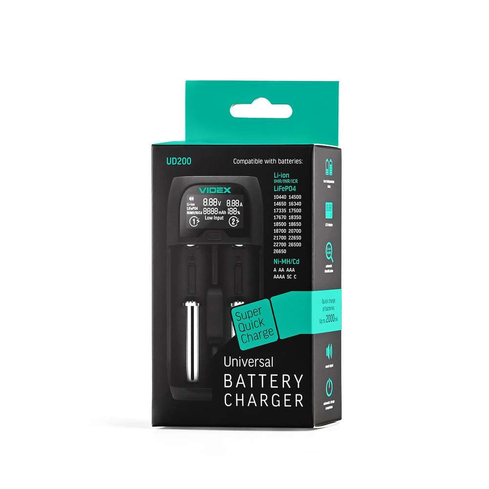 Ładowarka VIDEX UD200 obsługuje akumulatory LiFePO4, Ni-MH, Ni-Cd oraz Li-ion/IMR/INR/ICR, zapewniając wszechstronność i wygodę użytkowania. Wyposażona jest w dwa niezależne sloty, co pozwala na jednoczesne ładowanie dwóch baterii o napięciu 3,2 V i prądzie ładowania do 1A na kanał.