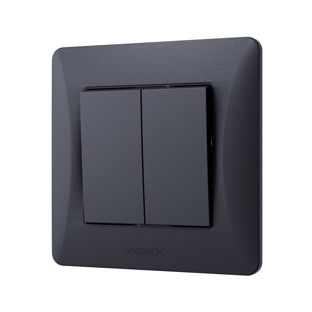- Podwójny włącznik BINERA w kolorze czarnym grafitowym, o napięciu 250 V i natężeniu 10A, do montażu podtynkowego, bez podświetlenia, z klasą szczelności IP20.