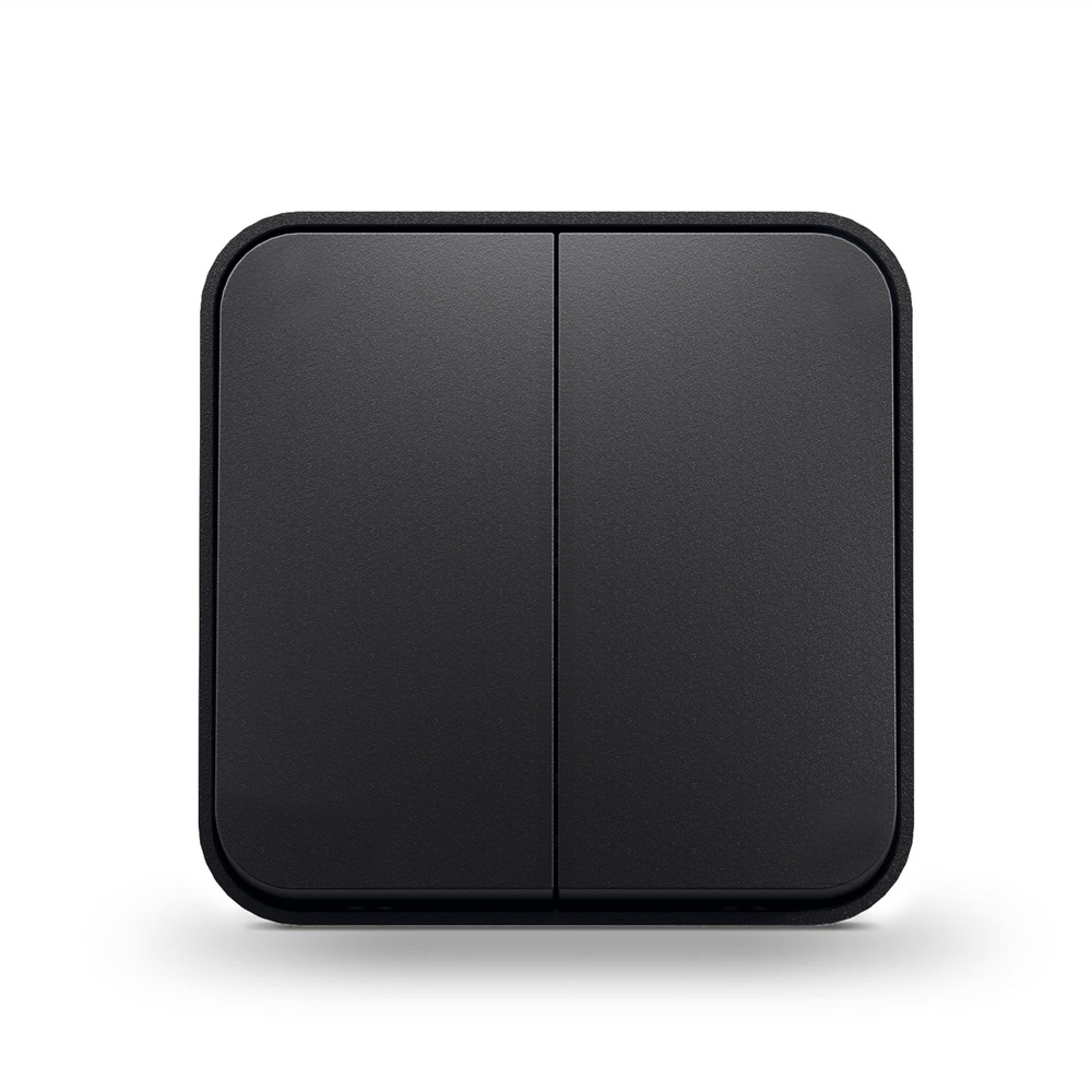 - Podtynkowy włącznik 2-krotny o napięciu 250 V i natężeniu 10 A, w kolorze czarnym graphite, klasa szczelności IP20, idealny do nowoczesnych wnętrz.