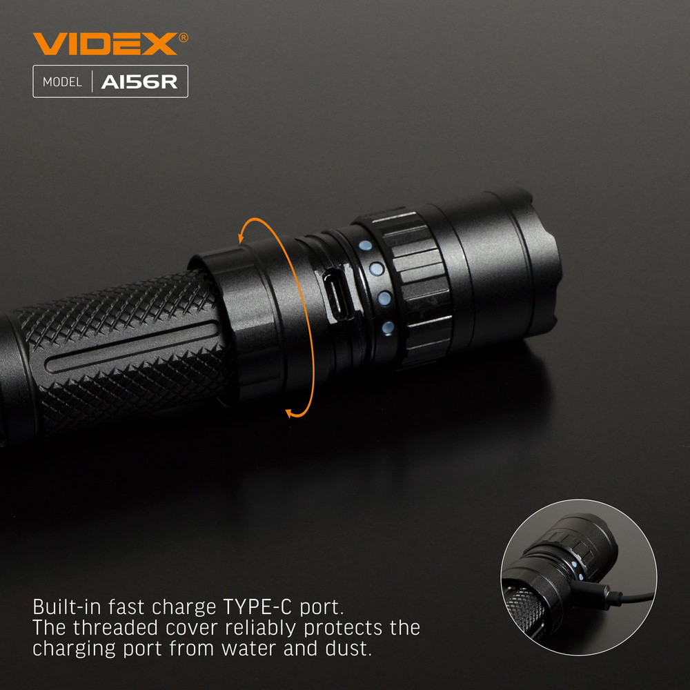 - Latarka VIDEX 20W 1700lm to lekka, odporna IP68 konstrukcja z aluminium lotniczego. Zasilana akumulatorem 4000 mAh, działa do 17h 50min, ładuje się 2,5h przez USB-C, ma wskaźnik baterii i zasięg 210 m.