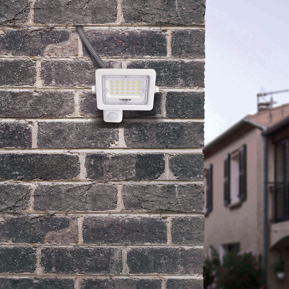 - Naświetlacz Videx LED 20W z czujnikiem ruchu to trwałe i energooszczędne oświetlenie zewnętrzne. Aluminiowa obudowa, IP65 i żywotność 30 000 h gwarantują niezawodność. Regulacja czujnika i elegancki biały design zapewniają funkcjonalność i estetykę.