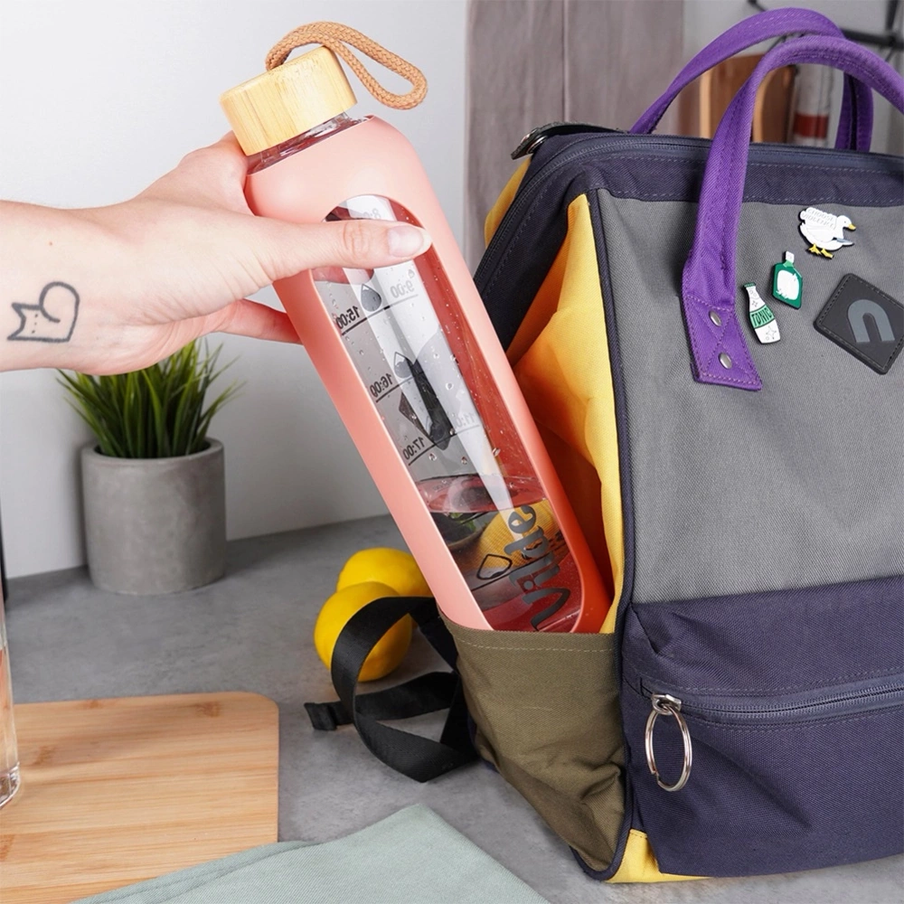 - Szklana butelka na wodę o pojemności 1 l z silikonowym pokrowcem. Posiada miarkę czasową, która ułatwia monitorowanie ilości spożywanej wody.