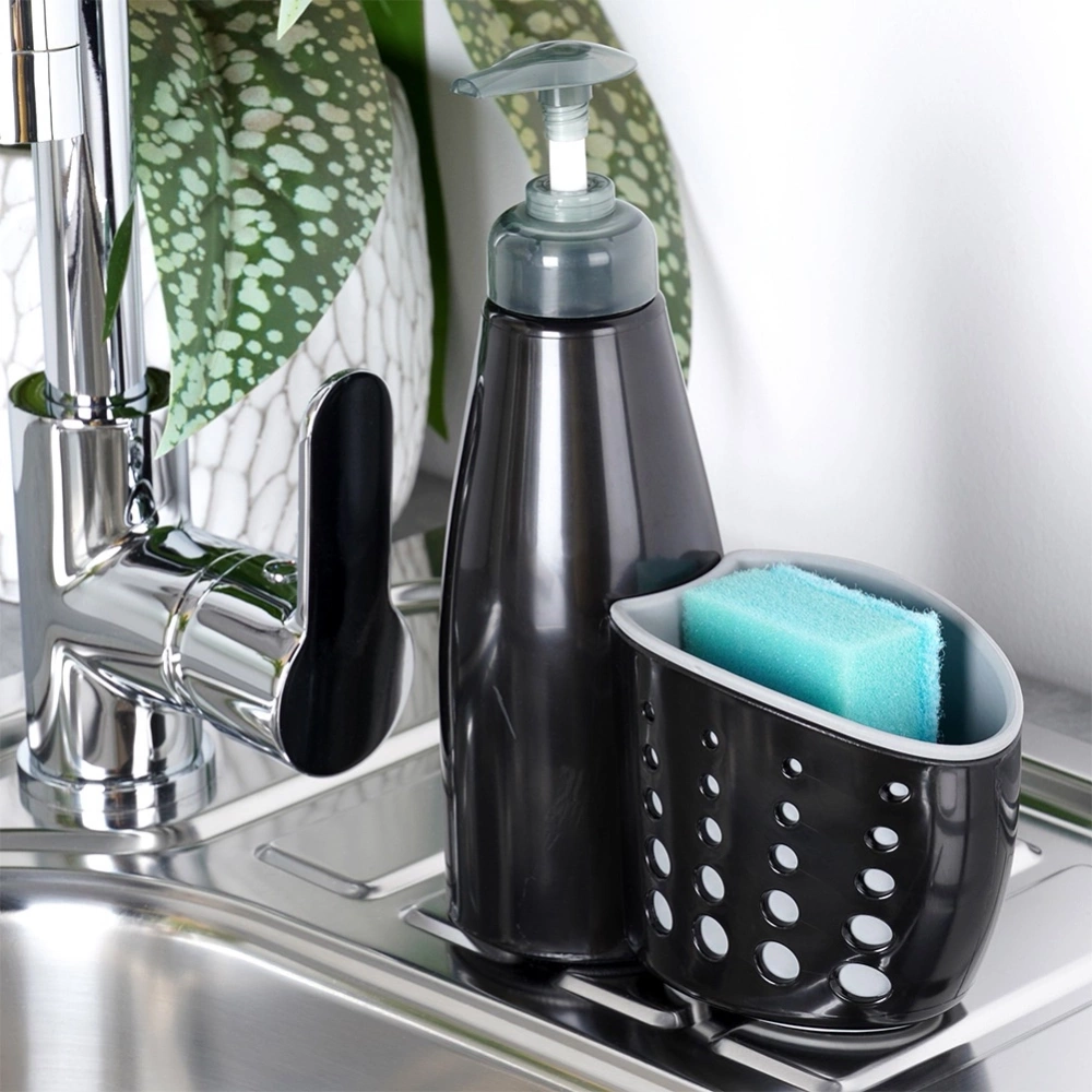 - Dozownik płynu do mycia naczyń o pojemności 370 ml. Posiada dedykowane miejsce na gąbkę. Niezbędny w każdej kuchni.