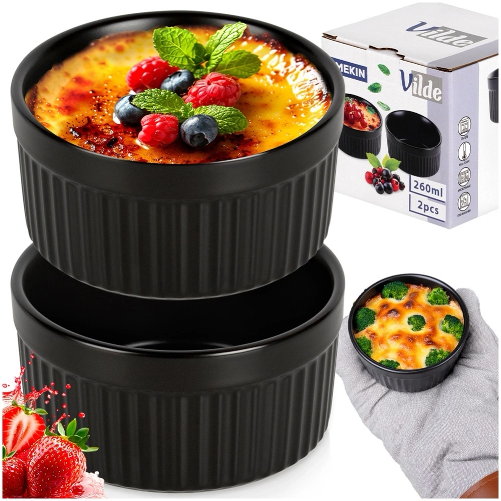 - Zestaw 2 szt. miseczek żaroodpornych - Zestaw dwóch miseczek do zapiekania w formie kokilek. Każda kokilkach o wymiarach 10 x 5 cm i pojemności 260 ml. Idealne do zapiekania ziemniaków, pieczonych warzyw, zapiekanek, deserów itp.