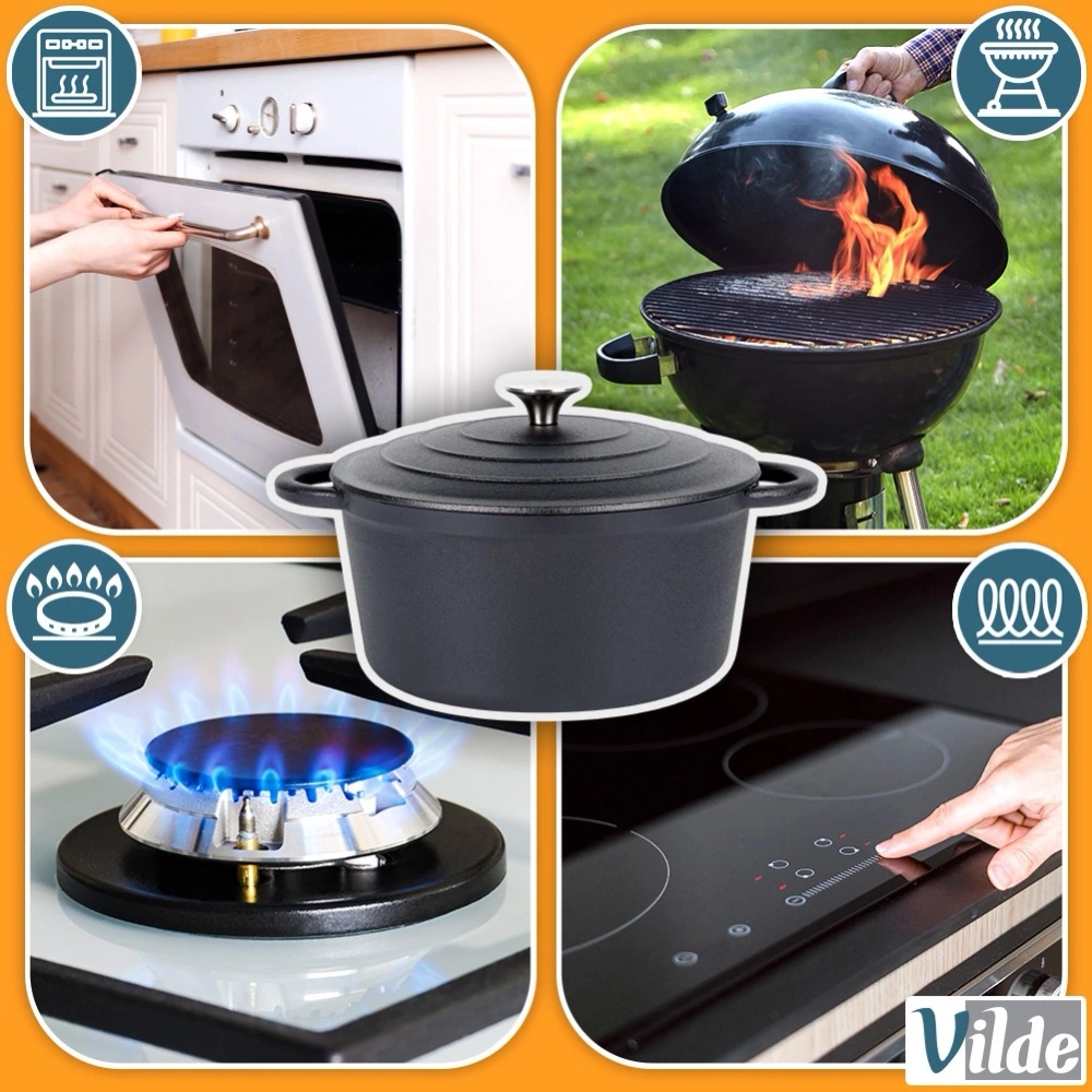 Garnek żeliwny z pokrywką przydatny w każdym domu. Idealny do gotowania, pieczenia, duszenia oraz smażenia potraw. Potrawy przygotowane w garnku będą soczyste i aromatyczne. Możemy użytkować ją w każdej kuchence, ale również bezpośrednio na grillu, czy ogniu. Żeliwo rozgrzewa się równomiernie i długo utrzymuje ciepło, dzięki czemu serwowane dania dłużej będą ciepłe. UWAGA! Po każdym użyciu umyć, wytrzeć suchą szmatką do sucha i natłuścić - w przeciwnym razie na naczyniu pojawi się rdza, co jest naturalnym procesem dla tego typu materiału. Naczynie nie posiada żadnych powłok typu "teflon". Regularna pielęgnacja zapobiega korozji i zapewnia długotrwałe użytkowanie naczynia. Oryginalny produkt marki Vilde z linii Cast Line. Wyprodukowano zgodnie z europejskimi standardami.