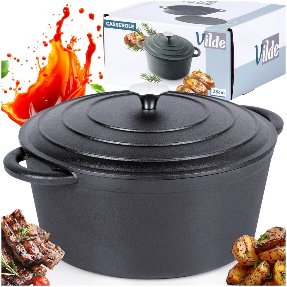 Garnek żeliwny z pokrywką przydatny w każdym domu. Idealny do gotowania, pieczenia, duszenia oraz smażenia potraw. Potrawy przygotowane w garnku będą soczyste i aromatyczne. Możemy użytkować ją w każdej kuchence, ale również bezpośrednio na grillu, czy ogniu. Żeliwo rozgrzewa się równomiernie i długo utrzymuje ciepło, dzięki czemu serwowane dania dłużej będą ciepłe. UWAGA! Po każdym użyciu umyć, wytrzeć suchą szmatką do sucha i natłuścić - w przeciwnym razie na naczyniu pojawi się rdza. Naczynie nie posiada żadnych powłok typu "teflon". Oryginalny produkt marki Vilde z linii Cast Line. Wyprodukowano zgodnie z europejskimi standardami.