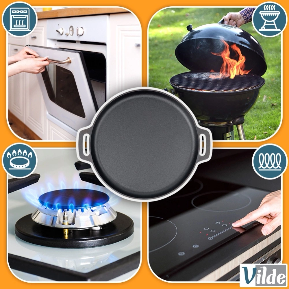 - Uniwersalne zastosowanie - Patelnia idealnie nadaje się do smażenia, duszenia, pieczenia i przygotowywania wszelkiego rodzaju dań czy przekąsek. Możemy przygotować na niej pizzę, pieczone ziemniaki, dania mięsne oraz warzywne. Sprawdzi się do przyrządzenia pysznego i aromatycznego jedzenia w każdej kuchni, na kempingu czy podczas grillowania. Patelnie wykorzystamy również do bezpośredniego serwowania dań np. pieczonych ziemniaczków.