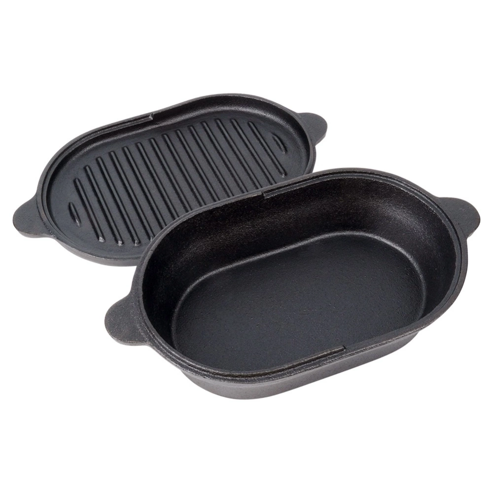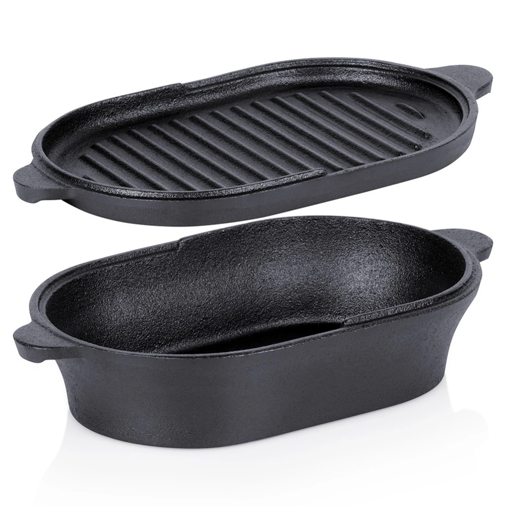 - Brytfanna żeliwna 2w1 - Mała brytfanna z pokrywką, która stanowi również osobne naczynie do zapiekania. Brytfanna doskonale nadaje się do pieczenia, duszenia i zapiekania mięs, warzyw, ziemniaków. Po zdjęciu pokrywki uzyskujemy dwa oddzielne naczynia. Wymiary zewnętrzne brytfanny bez pokrywki: 28 x 16 x 5,5 cm, wysokość z pokrywką wynosi 7,2 cm, a pojemność l. Pokrywka żeliwna z powierzchnią grillową ma wymiary 28 x 16 x 2 cm.