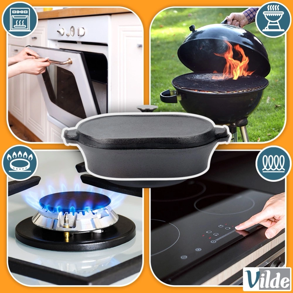 - Brytfanna żeliwna z pokrywą pełniącą rolę patelni grillowej. Nadaje się na każdy rodzaj kuchni włącznie z indukcją. Można stosować w piekarnikach i bezpośrednio na ogniu.
