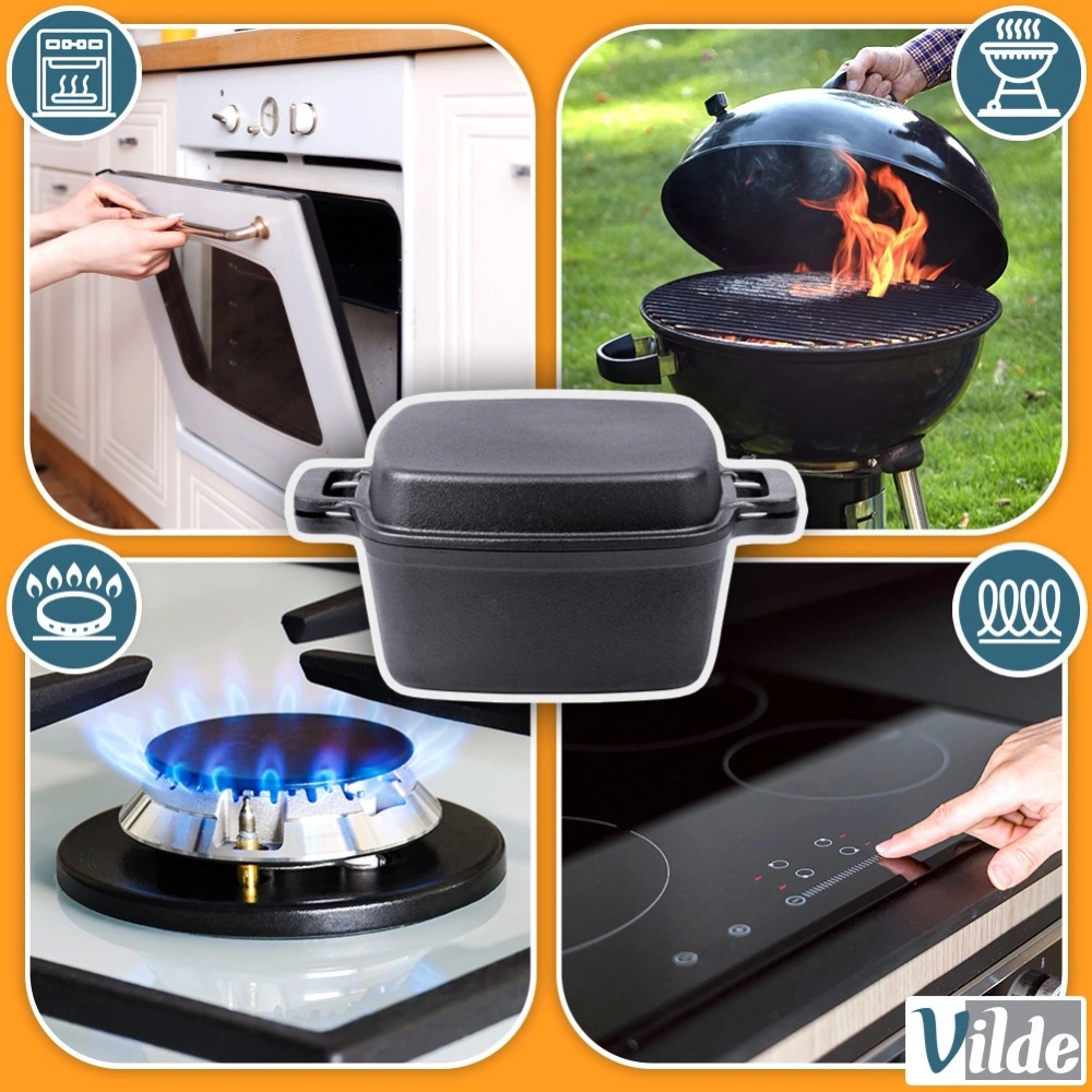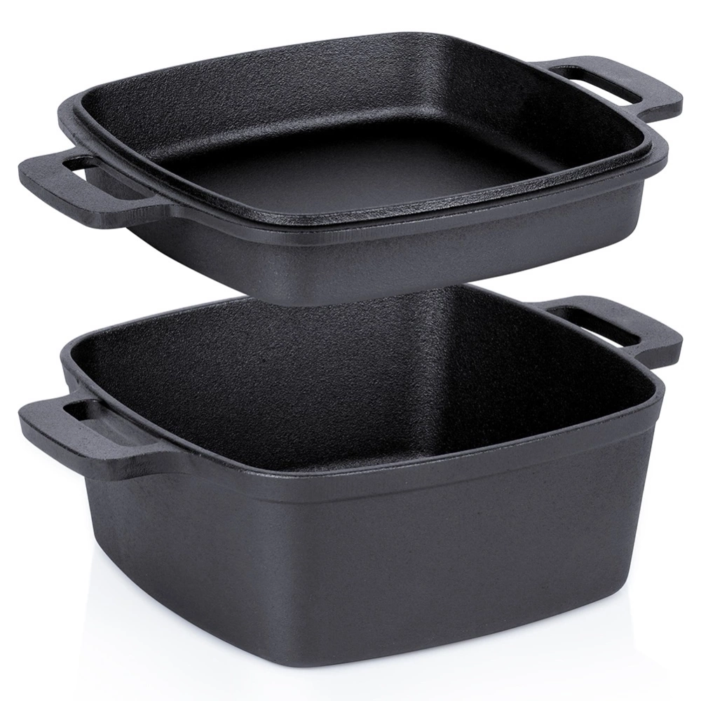 - Garnek żeliwny 2w1 - Kwadratowy garnek z pokrywką, która stanowi również osobne naczynie do zapiekania. Po zdjęciu pokrywki uzyskujemy dwa oddzielne naczynia. Wymiary zewnętrzne garnka bez pokrywki: 33,5 x 25 x 10 cm, wysokość z pokrywką wynosi 15 cm. Pojemność garnka wynosi 4,5 l. Pokrywka ma wymiary 33,5 x 25,5 x 5 cm i pojemność 1,8 l. Idealny do gotowania zup, duszenia mięsa, przygotowywania gulaszy oraz zapiekanek.