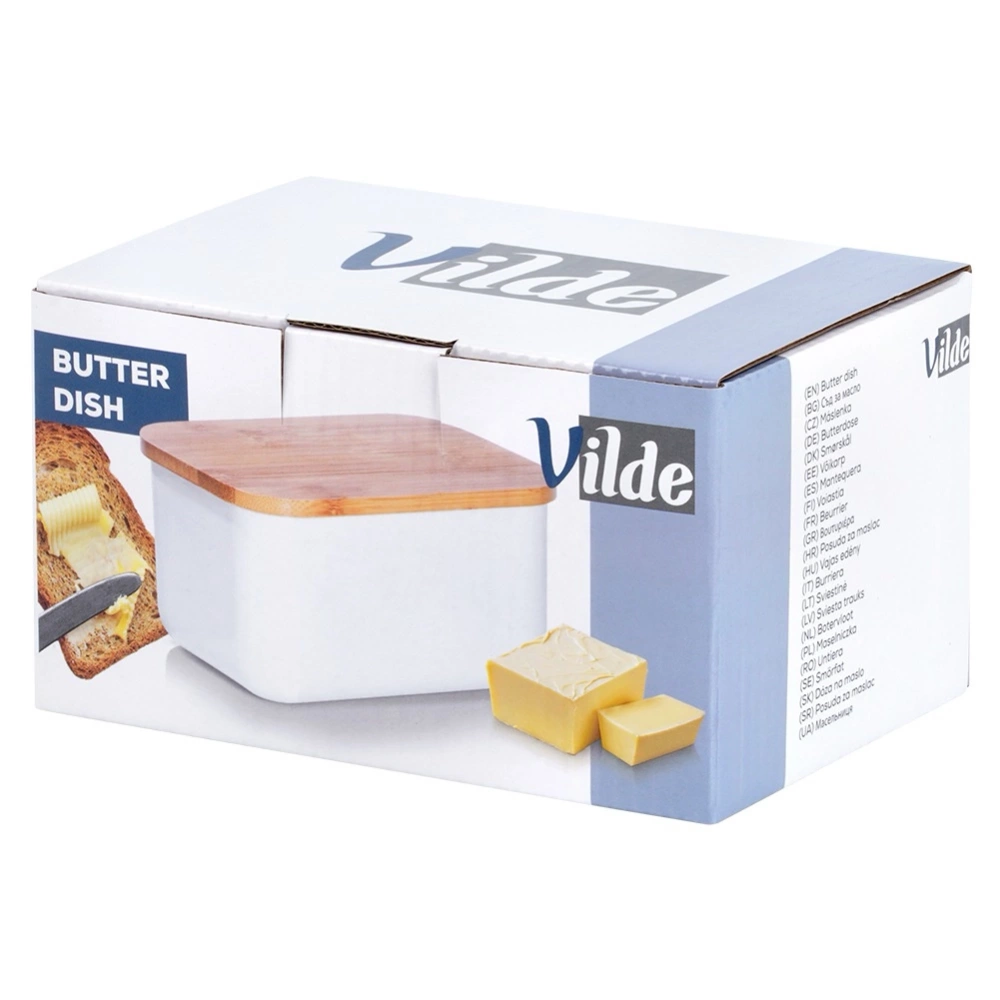 Przydatna maselniczka, która sprawdzi się do przechowywania oraz serwowania masła. Posiada praktyczne przykrycie. Wykonana z materiałów bezpiecznych dla zdrowia i neutralnych dla żywności. Klasyczny wzór sprawi, że będzie pięknie prezentować się z każdą zastawą stołową. Przydatna w każdym domu. Oryginalny produkt marki Vilde. Wyprodukowano zgodnie z europejskimi standardami.