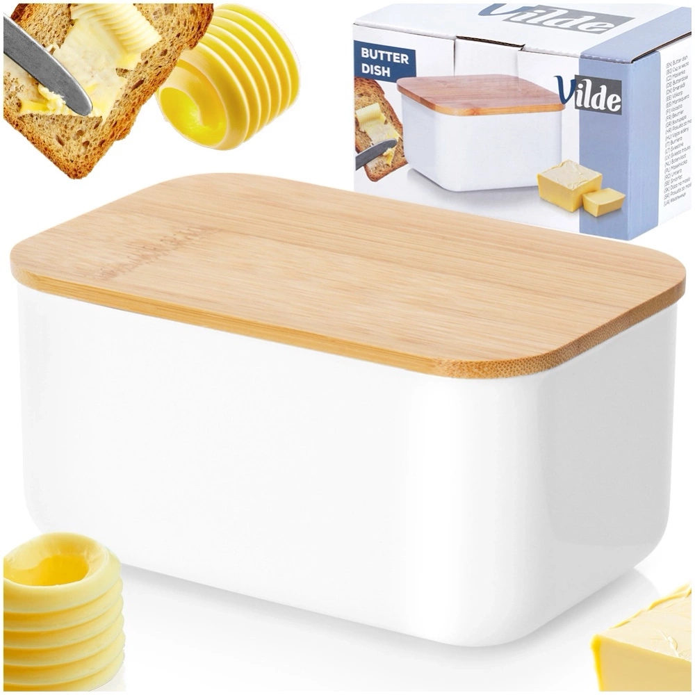 - Maselniczka wykonana ze stali w kolorze białym z bambusową pokrywką. Idealna do przechowywania i serwowania masła.