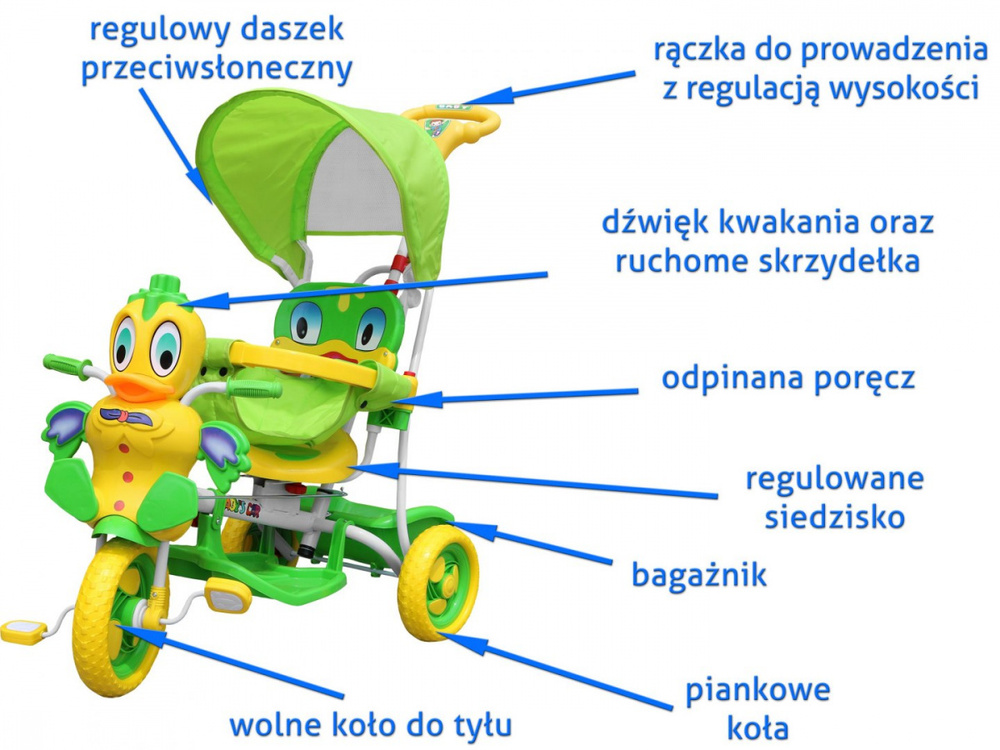 - regulowany, 3 stopniowy drążek połączony z kierownicą, którym można skorygować manewry dziecka, - bezpieczne koła z kolorowymi kołpakami, - regulowany baldachim ochronny przed słońcem, - przyciski włączające dźwięki na główce, - kosz (bagażnik) tylni na zabawki, - rozpinana poręcz zabezpieczającą dziecko przed upadkiem, - stabilna i trwała stalowa rama, - przednie koło wyposażone w sprzęgło, - demontowana podstawka pod stopy, - regulowana odległość siedzenia do pedałków, - pokrowiec na siedzisko, - wiek od 1 do 5,5 roku życia - kaczuszka trzepocze skrzydełkami po naciśnięciu przycisku na główce, - szerokie koła wykonane z miękkiej pianki, |