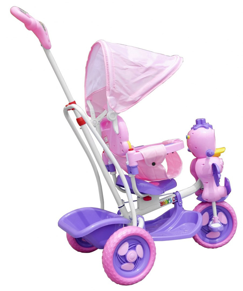 3-kołowy Rowerek dla dzieci Kaczka Fioletowy + Dźwięki + Daszek + Barierka + Podnóżek + Rączka + Schowek