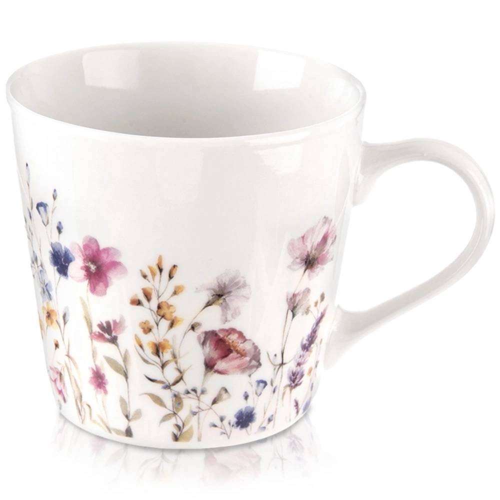 - Kubek 430 ml do picia kawy, herbaty i innych napojów. Kubek jest wykonany z białej porcelany z motywem kwiatów. Posiada wygodny uchwyt. Nadaje się do zmywarki i mikrofalówki.