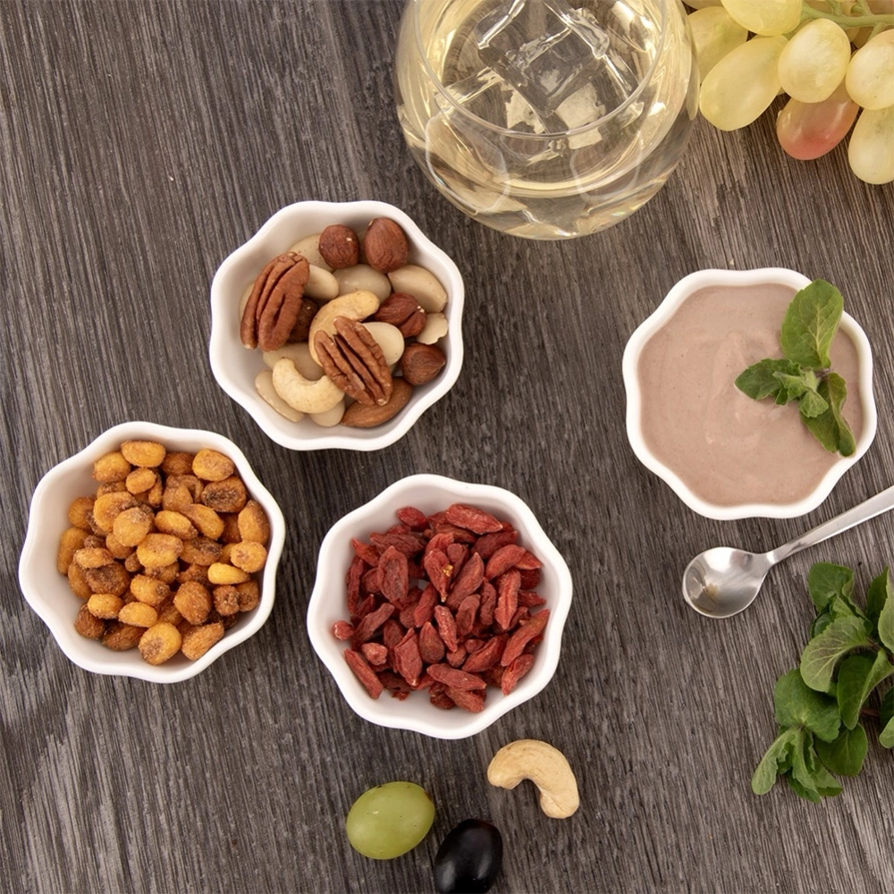 - Uniwersalne zastosowanie - Idealnie sprawdzą się do serwowania małych przekąsek, np. orzeszków, suszonych owoców. Miseczki można wykorzystać również do podawania mini deserów, dipów i sosów.