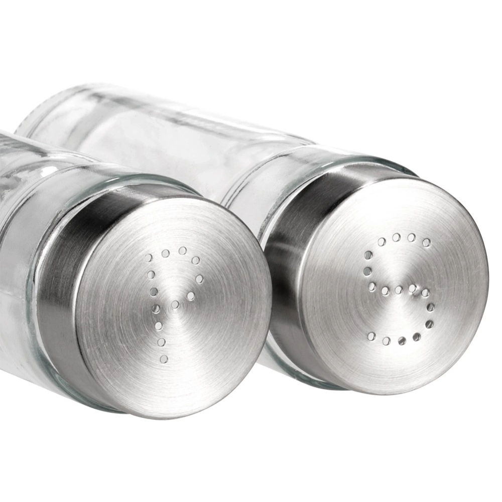 - Zestaw dwóch pojemników do podawania soli i pieprzu. Wykonane z grubego, przezroczystego szkła. Niezbędny zestaw w każdej kuchni.