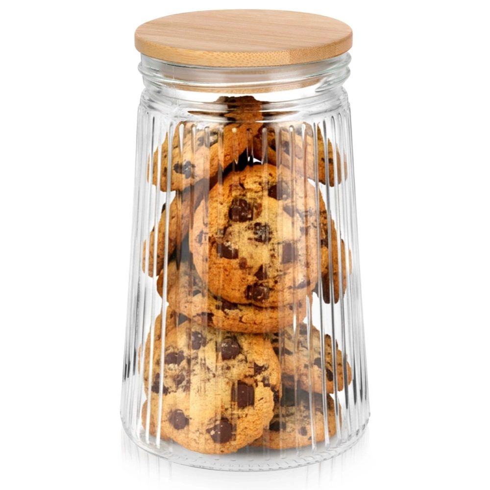 - Odporne szkło i drewniana pokrywka - Pojemnik wykonany ze szkła borokrzemowego, które cechuje się dużą odpornością na zmianę temperatur. Szkło ma eleganckie zdobienia w postaci ryflowanej powierzchni, co nadaje mu efektowny wygląd. Pokrywka wykonana z drewna bambusowego.