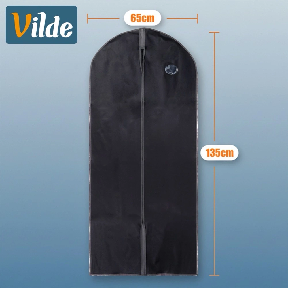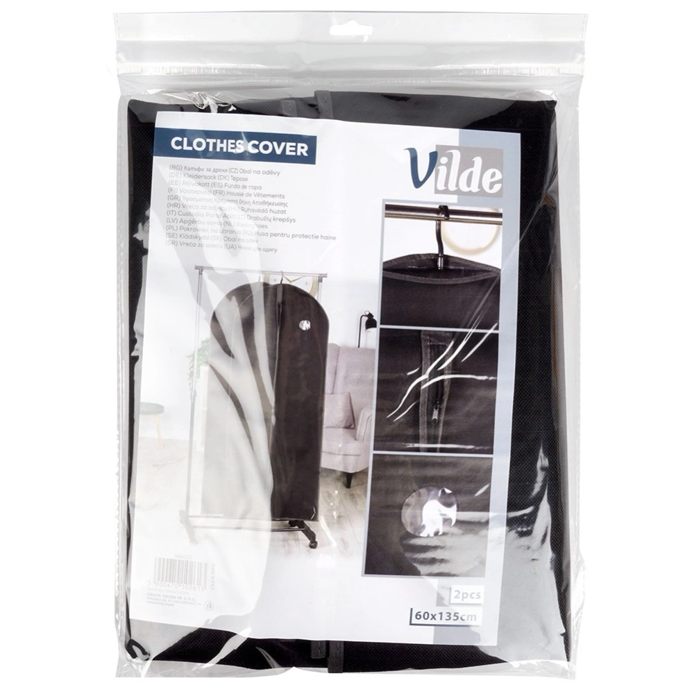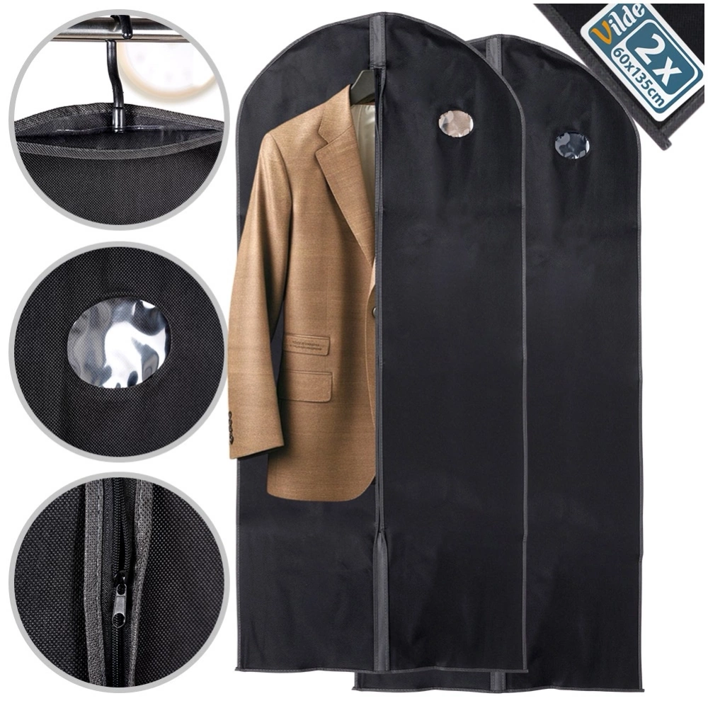 - Zestaw 2 pokrowców na ubrania 60x135 cm - Zestaw dwóch praktycznych pokrowców do przechowywania odzieży o wymiarach 60 x 135 cm każdy. Idealne do ochrony płaszczy, garniturów, sukienek i innych elementów garderoby przed kurzem, wilgocią i zabrudzeniami.